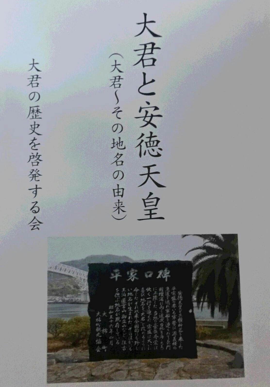 故平口武大柿町長を中心とする8名が町長宅に集まり、大君の将来について話し合う中、安徳天皇の伝承をまとめることになり、その会の名称を「大君の歴史を啓発する会」とし、会の趣旨に賛同する会員も多数加わり、活動を開始した。その主な活動は、安徳天皇の大君来訪を、書物、史跡、神社等からまとめ上げて冊子「大君と安徳天皇」を作成し、地域内に「平家口碑」、「蹴り小島」、「王泊」等の歴史説明の看板を掲げ、江田島市の陸の玄関といわれる早瀬大橋に「安徳天皇ゆかりの地・大君」大きな垂れ幕を掲げる等して活動を続けています。