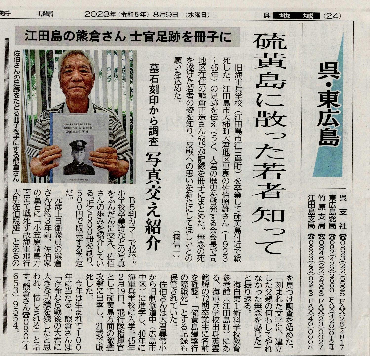 2023/08/27 11:07海軍飛行大尉 佐伯照雄 冊子 「海軍飛行大尉 佐伯照雄」の最終校正の段階に入ってます。海軍兵学校生に憧れ、大君尋常小学校から国内屈指の修道中学校(現 修道高等学校)に進み、見事に海軍兵学校に合格。卒業後少尉候補生を命ぜられ飛行学生を拝命される。 もっと見る