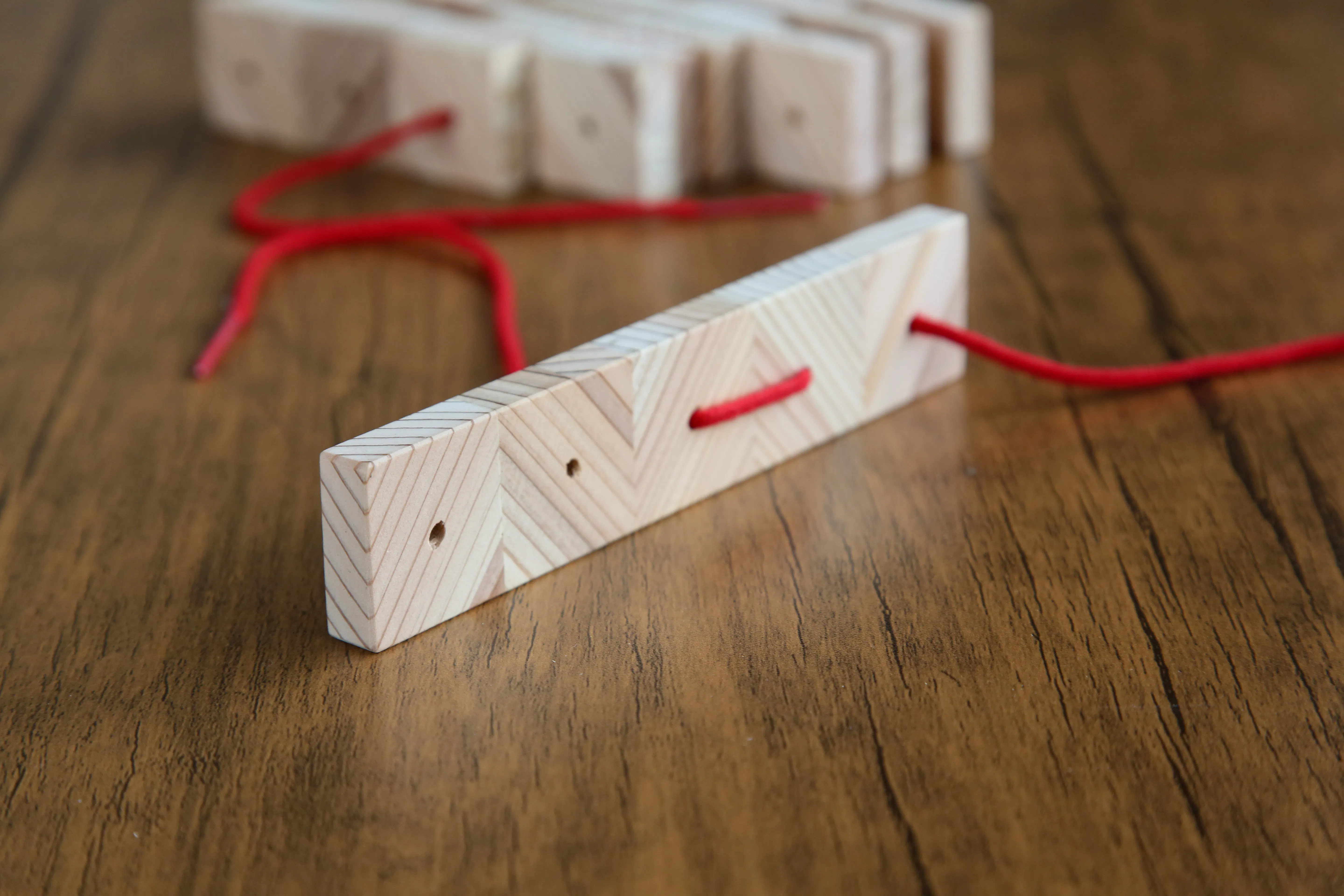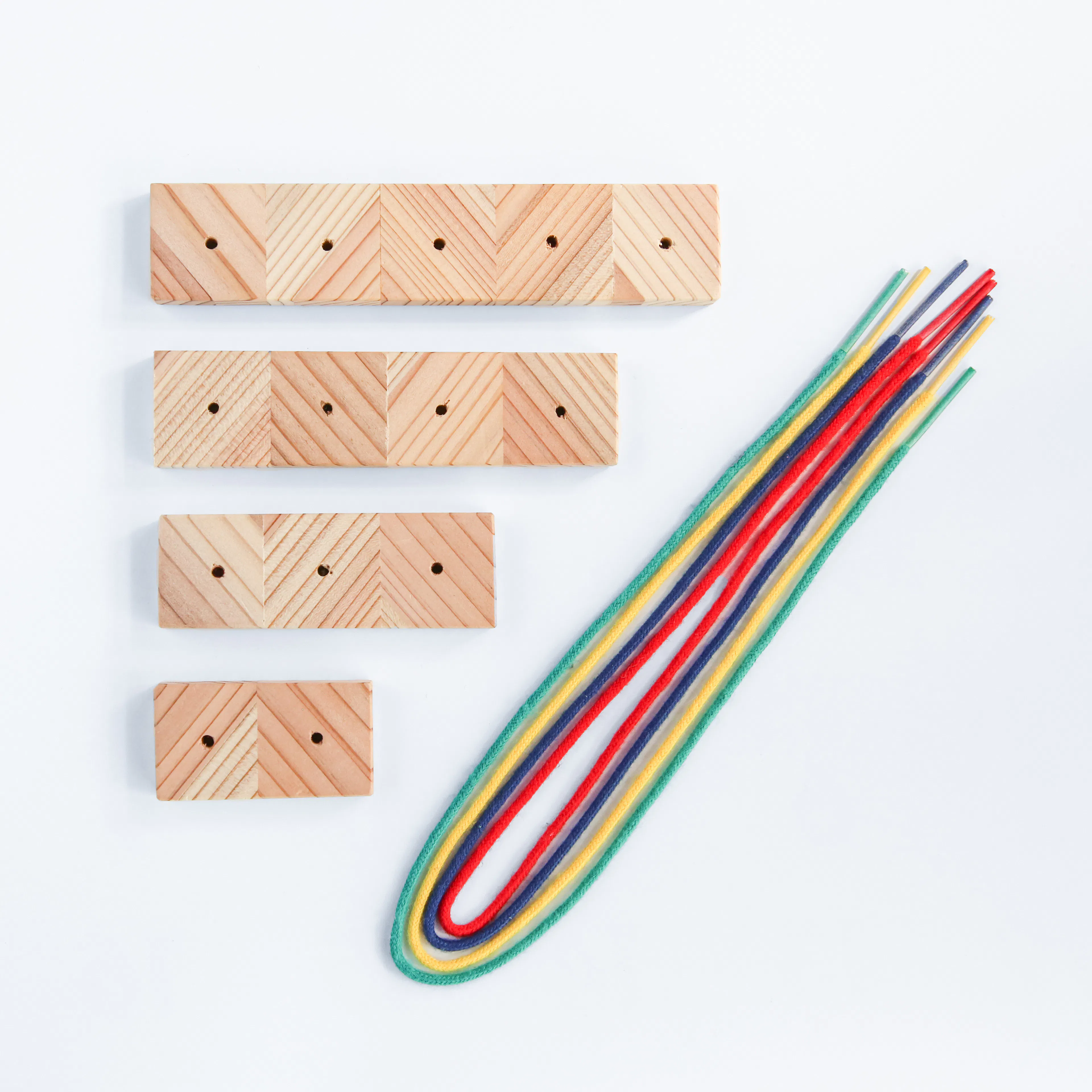 矢羽模様のマス目がある2マス~5マスの木のブロック16個と16本の紐がセットになっています。