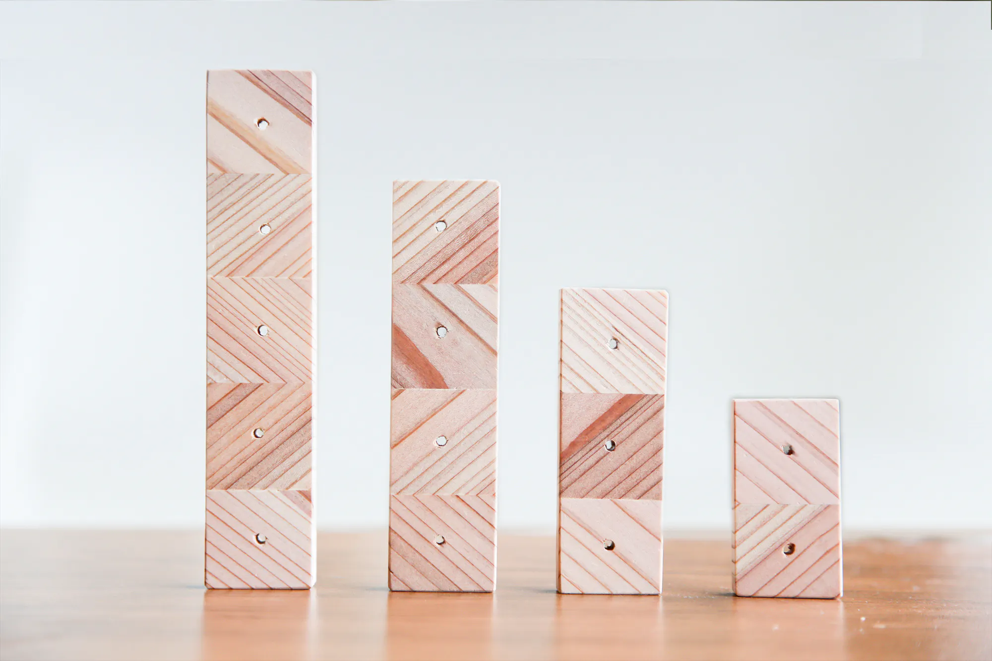 5歳の娘は、ブロックを階段状に組み立てる遊びも楽しんでおり、自然と遊びの中で数の違いに着目したり、それを組み合わせて形作るのは数の学びに役立ちそうです。天然の木目が活かされた温かみがありシンプルなデザインと、カラフルな紐の組み合わせは、子どもの想像力を膨らませるとともに、家のインテリアの中にも自然と馴染むのが親にとっても嬉しいです。