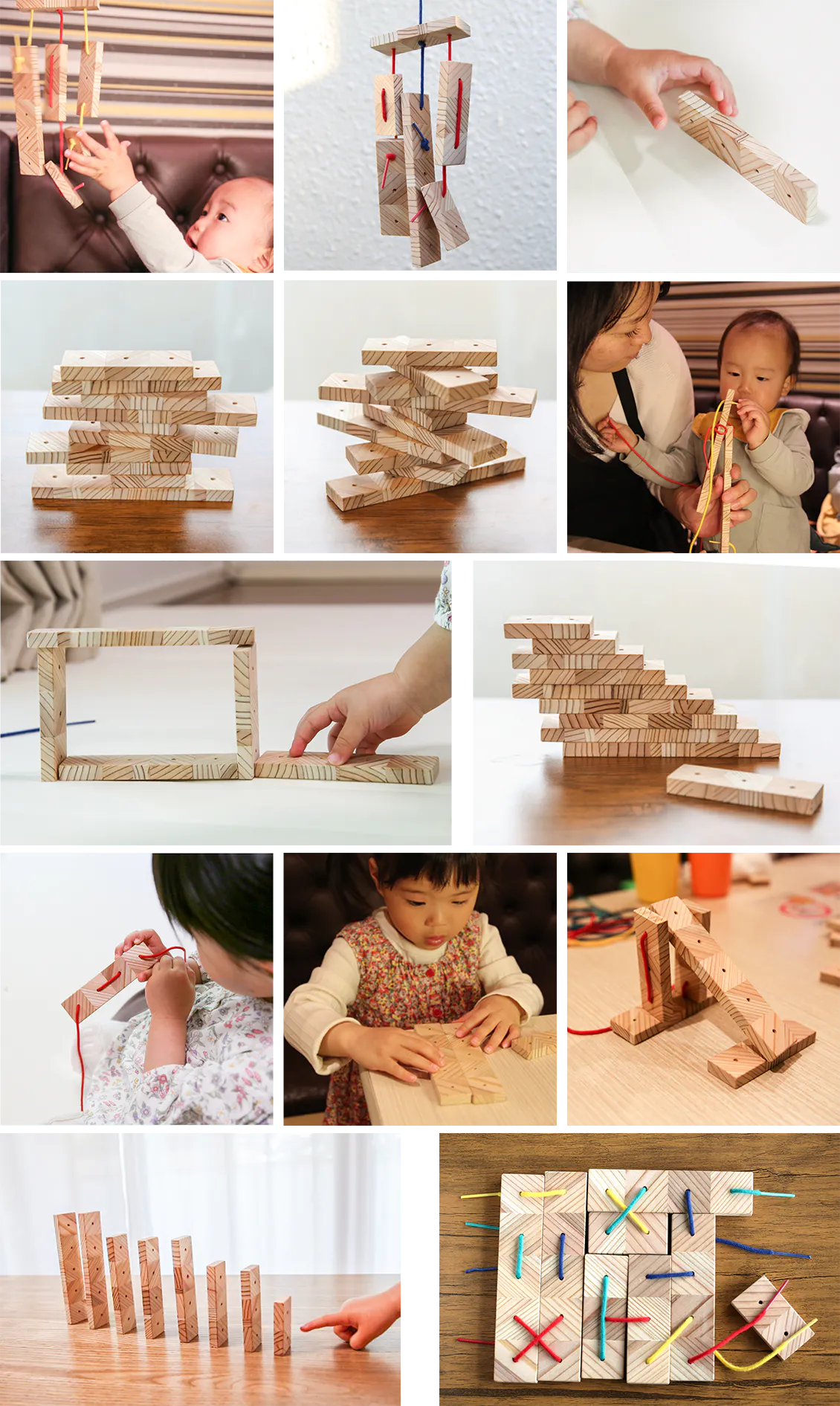 これらはあくまで私がこのブロックを使って発見した遊び方の例です。この商品が、皆さまのお手元、こどもたちの手に渡ったときに、私も発見できていない新しい遊び方、思いもよらない使い方が見つかるとおもしろいなとワクワクしています。