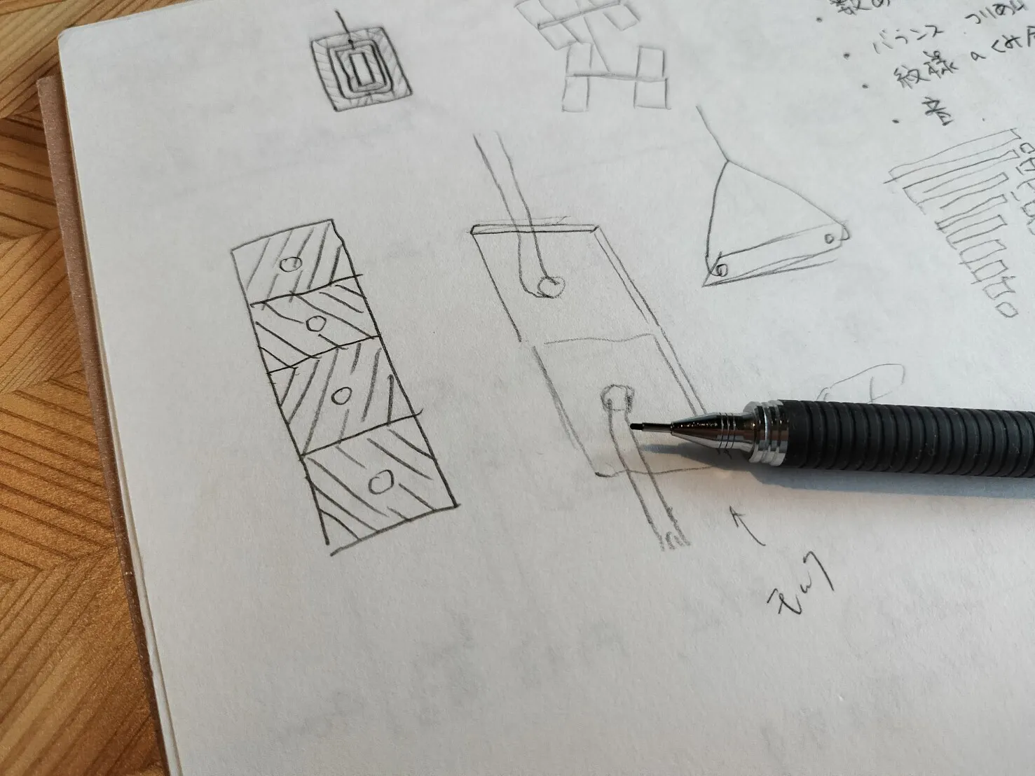 使い方を変えて長く使えること、シュタイナーのような知育の要素を踏まえたい、といったポイントもここで明文化。そしてすでに、「後で積み木として遊べるモービル」というやばねブロックの片鱗が出てきていましたが、この日はこれで時間切れ。