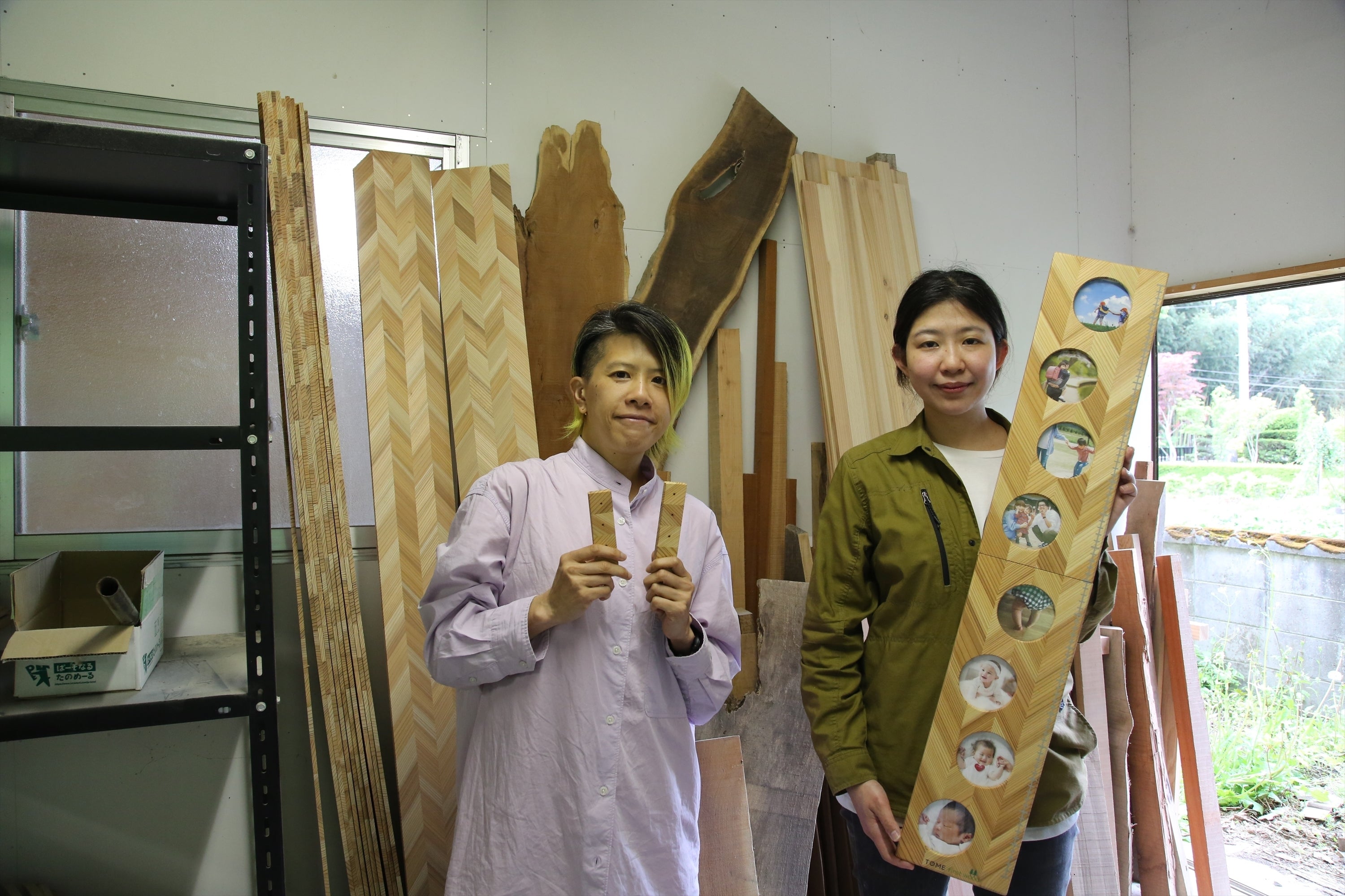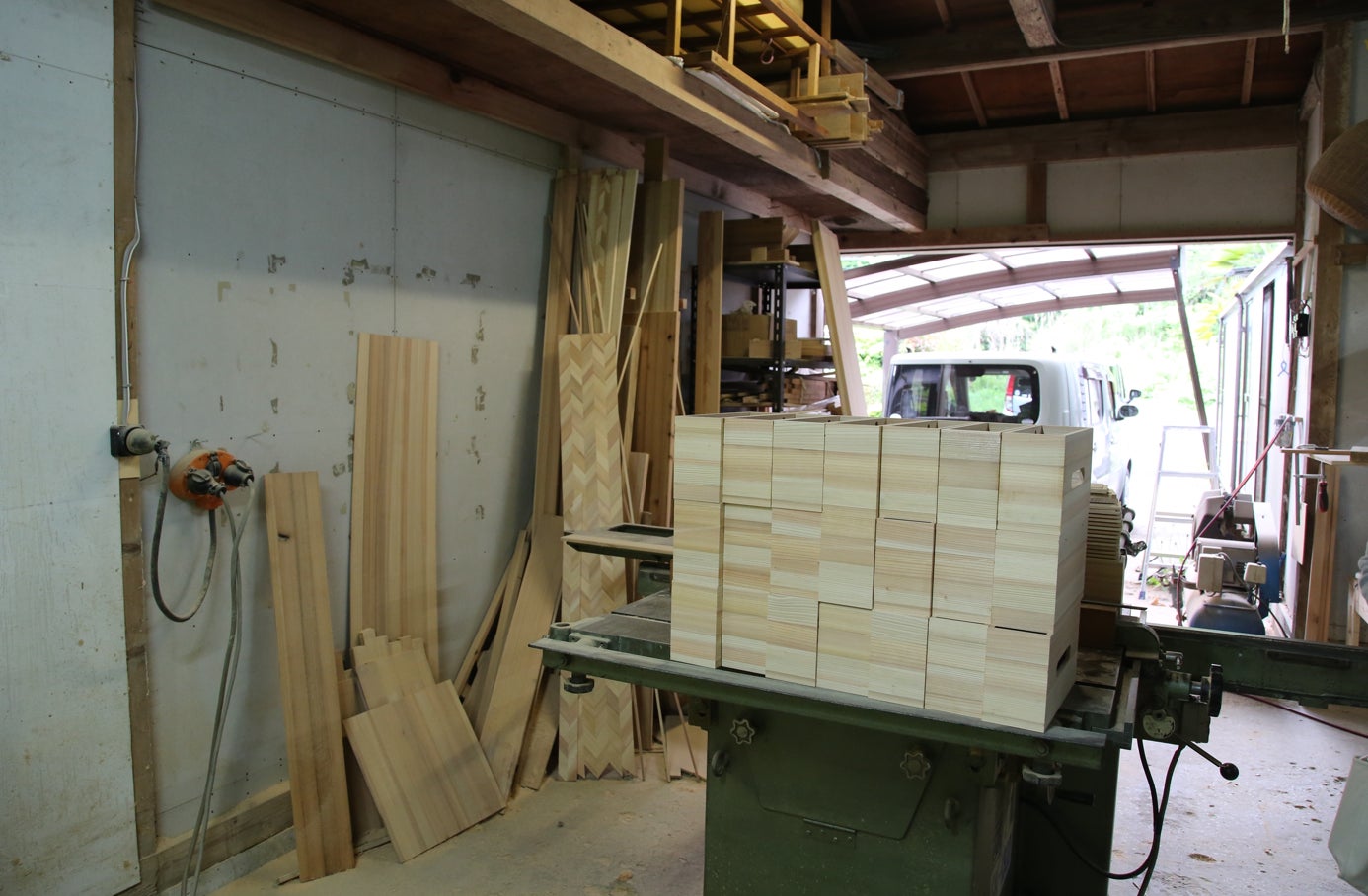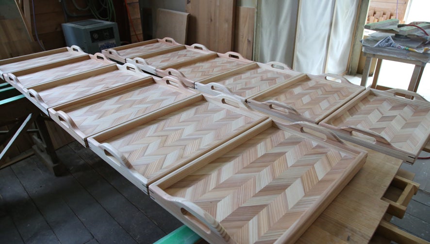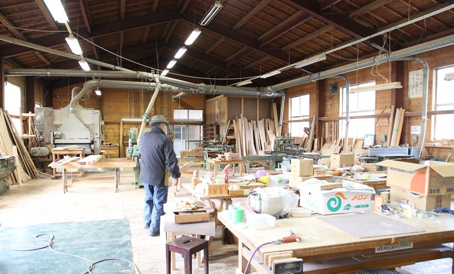 ここは複数の職人さんが共同で運営しており、登米市の職人さんのほとんどが利用されている場所で、矢羽集成材のほか、登米市内の道の駅で購入できる様々な木製品が作られています。