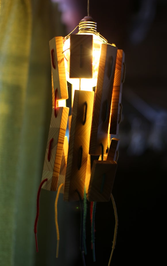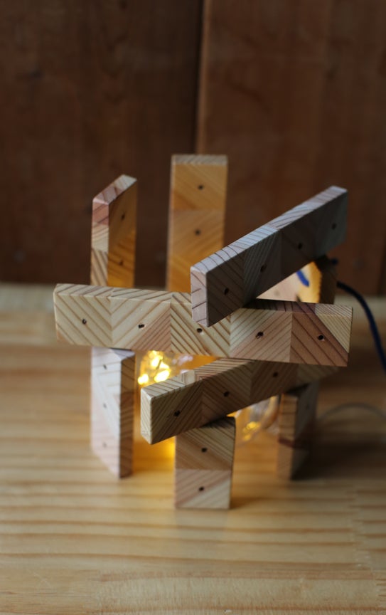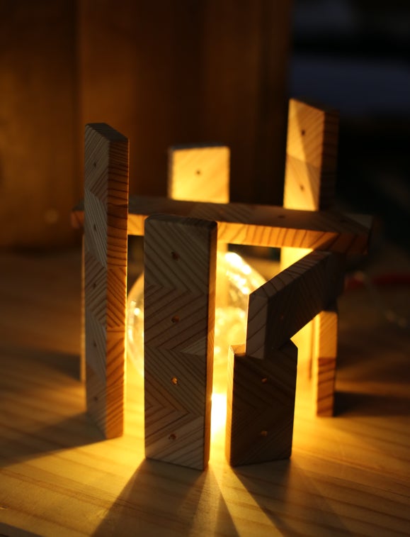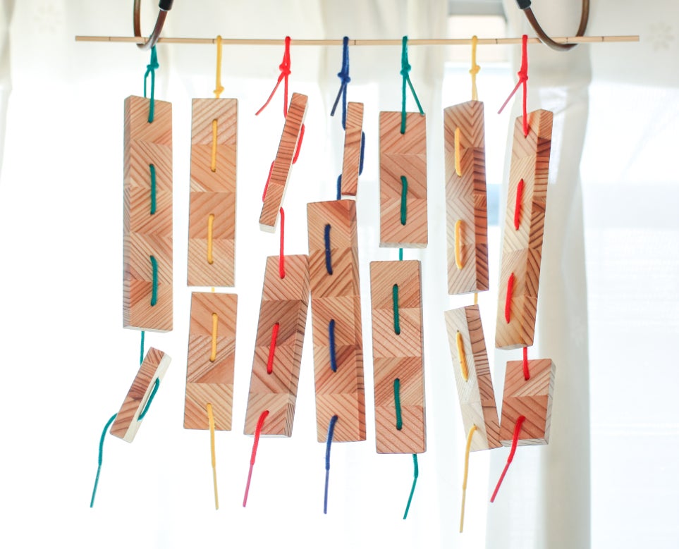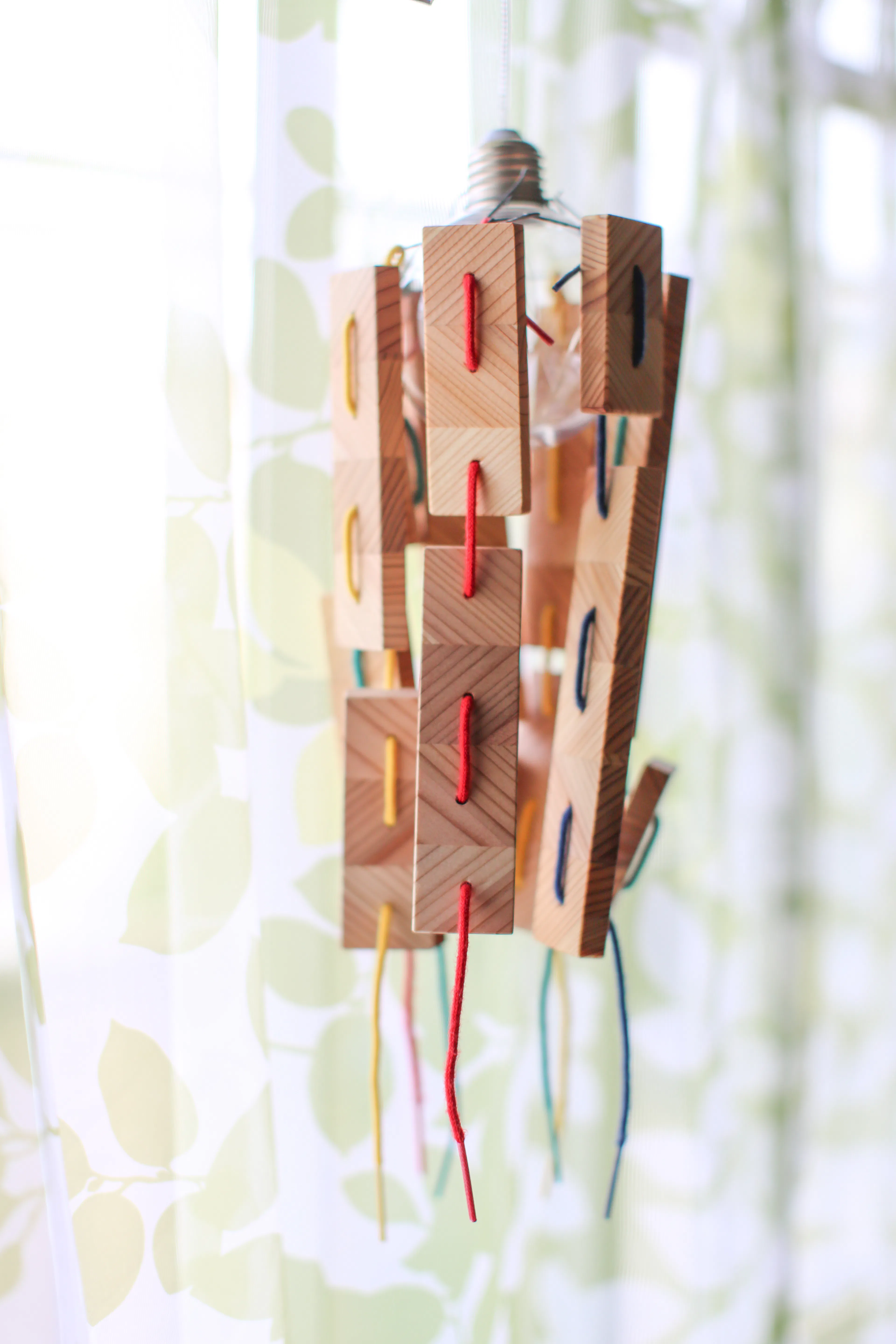 今日は、こどもたちのおもちゃとしての使い方だけでなく、インテリアとしての使い方のご紹介です。たとえばランプシェード。こちらは手元にあったランプに、針金を使ってやばねブロックを釣っただけのものですが、窓辺に置いておくと、夜風でゆらゆらと揺れる光を楽しむことができます。合わせて、ブロック同士がころころ優しい音を奏でます。