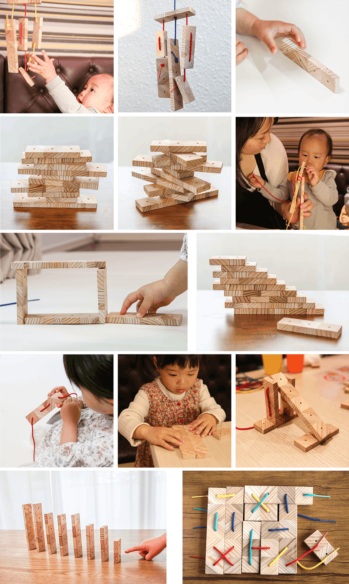 シンプルな木の素材とカラフルな紐をつかって、さまざまな遊び方ができる知育玩具を目指しました。