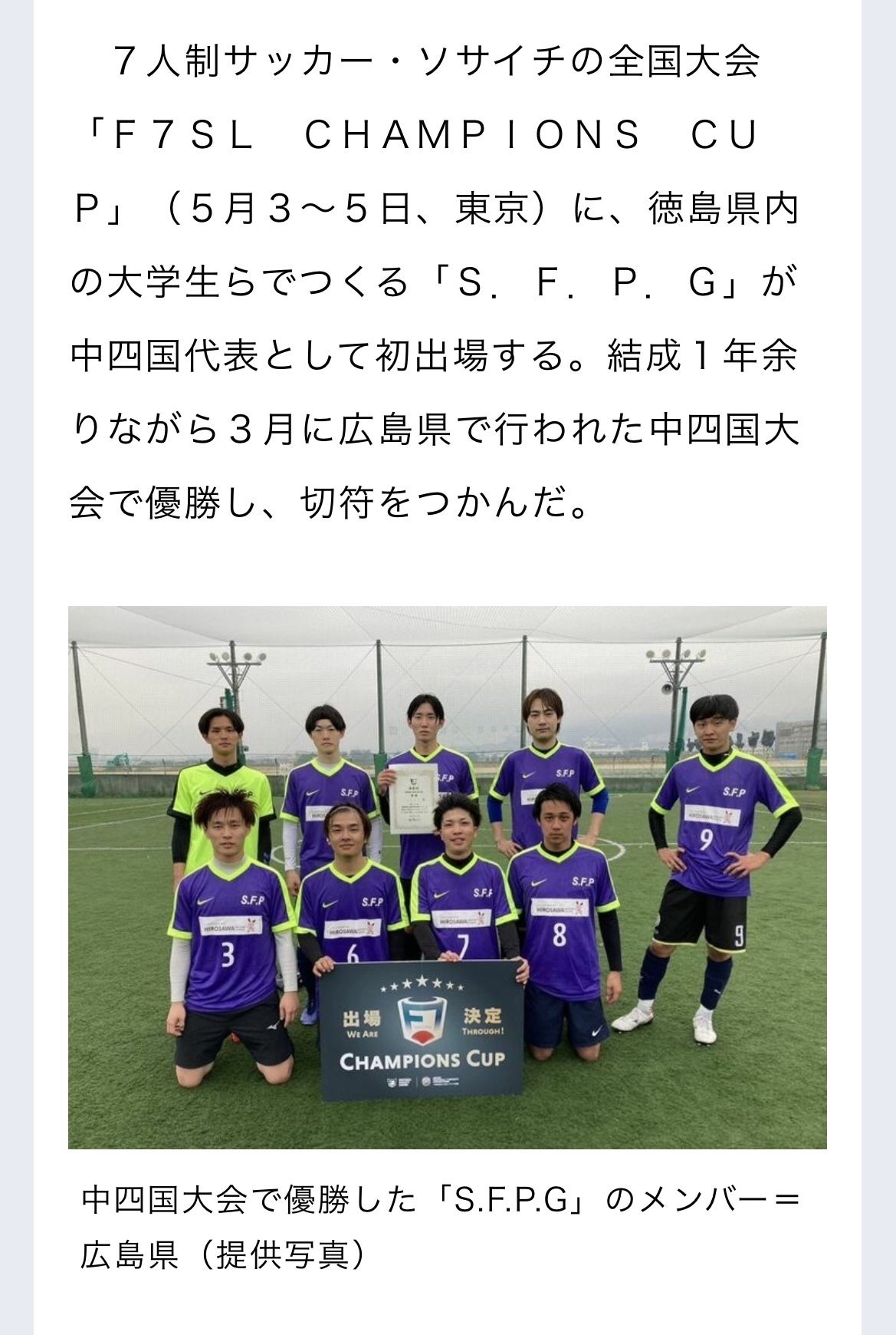 今回このシュウコウフットサルパークを拠点として活動しているソサイチチーム「S.F.P.G」が、中四国予選を勝ち抜きゴールデンウィークに東京で行われるソサイチの全国大会「F7SL CHAMPIONS CUP」に出場することが決定いたしました。