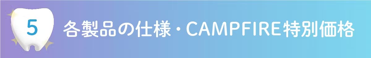 pbmヒーリングホワイトの各製品の仕様と、CAMPFIRE限定でお得な価格でご提供いたします!早割はどれも限定数があります。ホームホワイトニングが気になっていた方は、ぜひこの機会にお早めにお試しください!