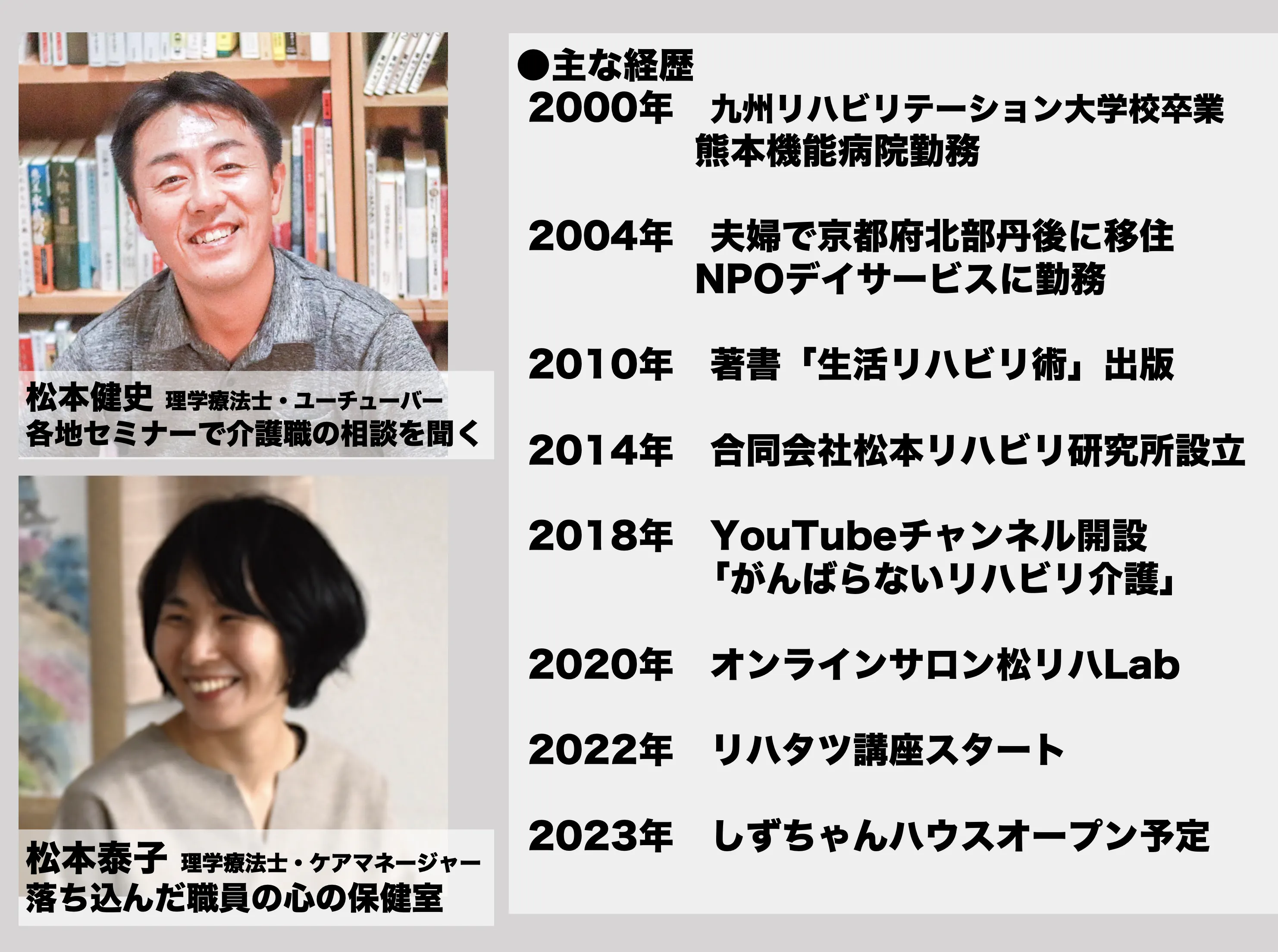 私たち夫婦、松本健史と松本泰子は京都の北端、丹後に移住し20年、高齢者のリハビリ介護を専門に活動をしてきました。夫婦共、理学療法士というリハビリ専門職です。高齢者に無理な運動をさせるのではなく、生活の中で元気になれる関わりや環境設定を大切にしてきました。私たちは「生活とリハビリ研究所」の三好春樹氏はじめ先人たちが提唱してきた「生活リハビリ」をいかに現場で実践できるか?と試行錯誤してきました。そして現場で役立つ介護の本を出版したり、研修セミナーを開催したりする機会をいただきました。日本各地の熱心な介護職さんとつながることができました。