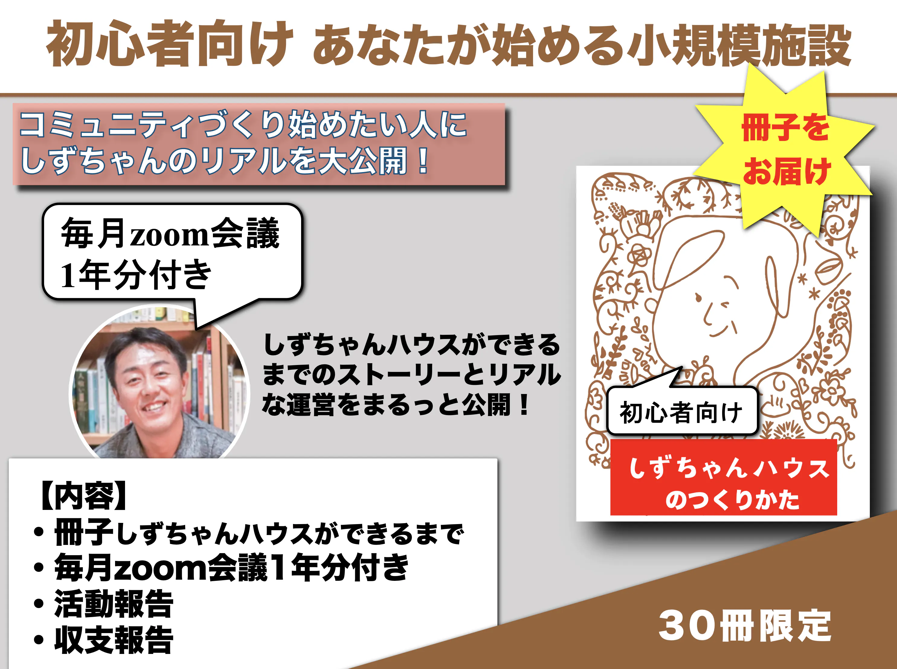 ●初心者向け あなたが始める小規模施設(5万円)ツキイチzoomに参加できます(1年間)。
