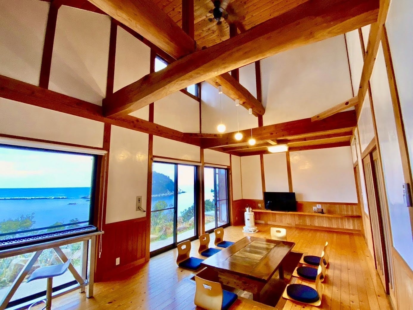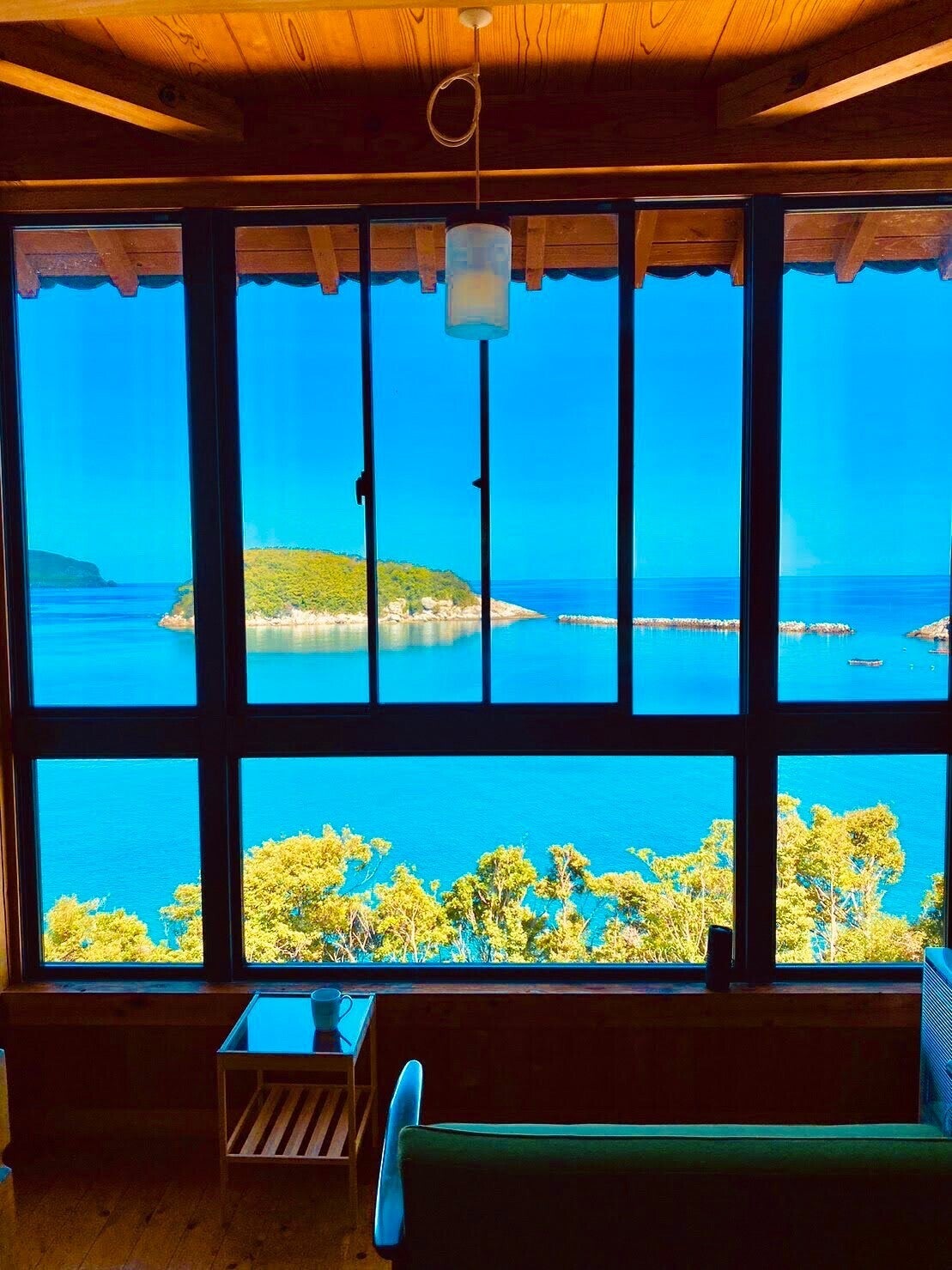 ゆずり葉のリビングからは、神ノ島・下根緒島・上根緒島の3つの島が浮かぶ対馬の海が一望できます。