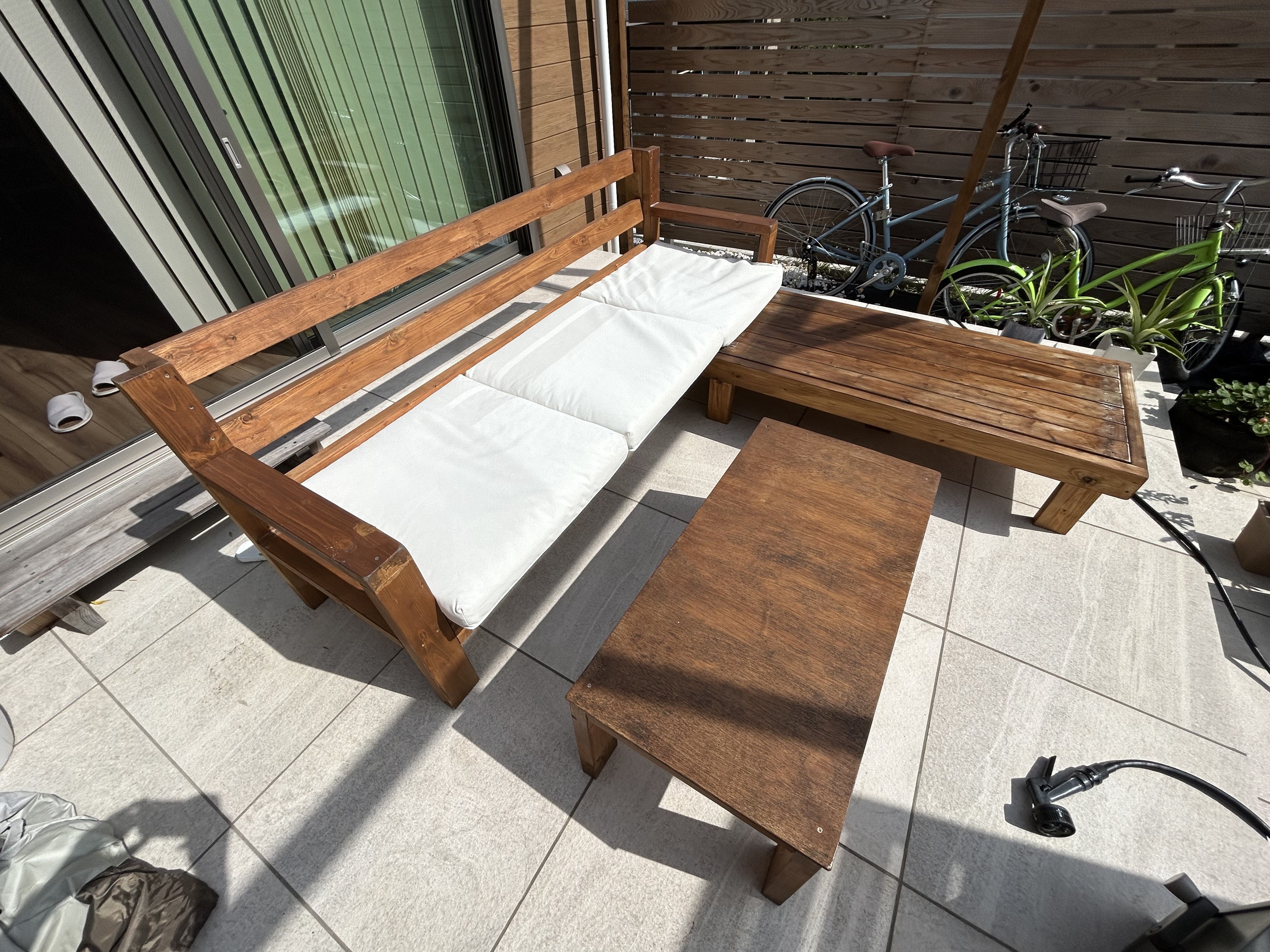 [DIYで作ったアウトドアソファ。店内の家具や内装なども自分でやってみるのが目標]