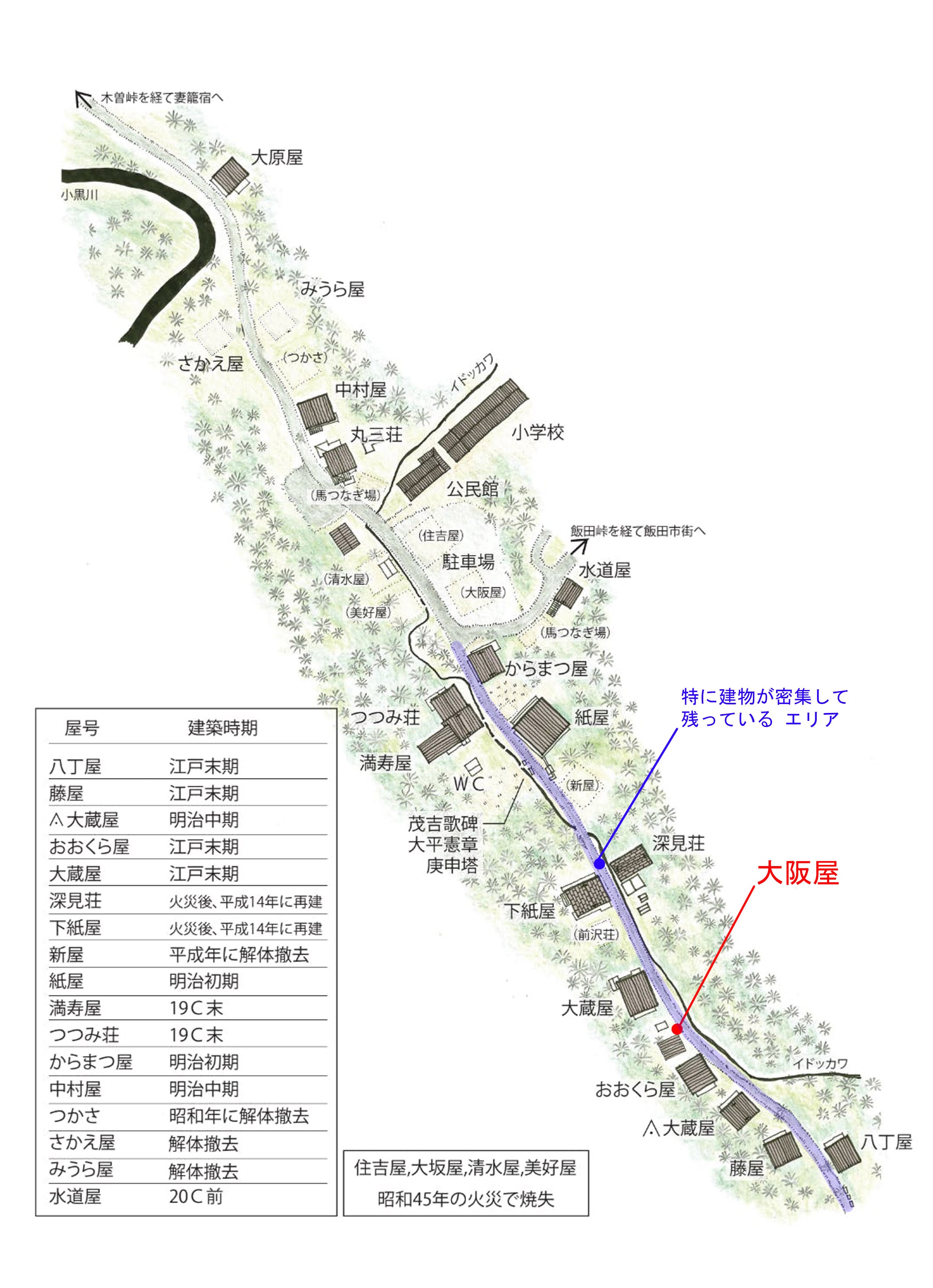 平成 2 年(1991 年)には、飯田市が「ふるさとづくり特別対策事業」により、旧道沿いにある 9 つの民家の保存修復と旧道の整備を行いました。この活動には、建築家の吉田桂二氏とその呼びかけに賛同した私たち「生活文化同人」のメンバーも関わり、民家の修復工事の設計に携わりました。その後、地元の方々の管理もあり、江戸時代から昭和初期までの歴史的建造物が今も現地に保存され、活用されています。