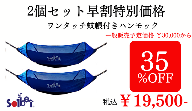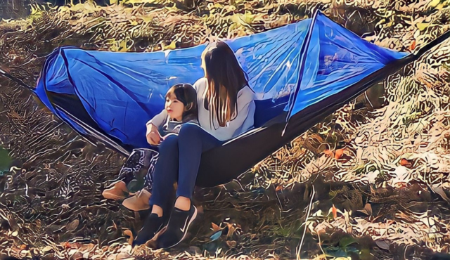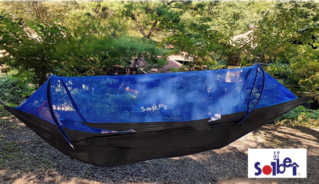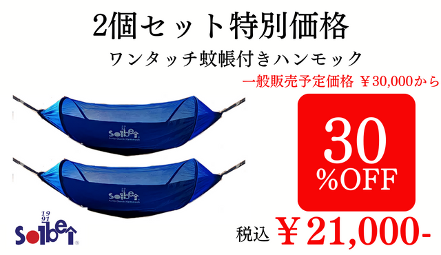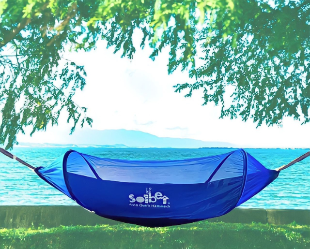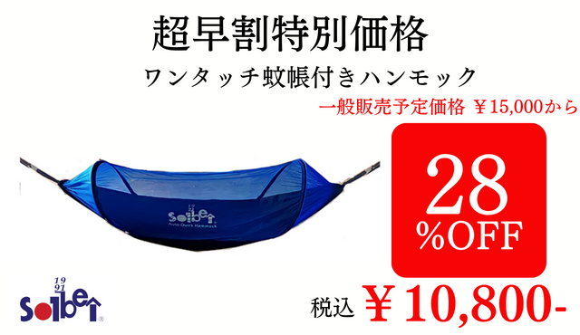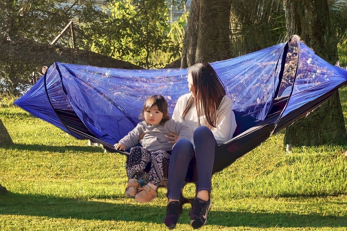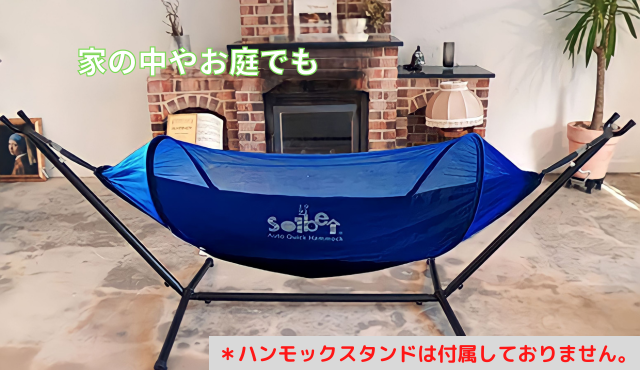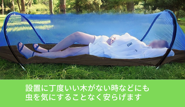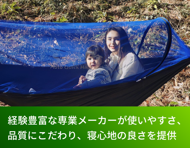 子供の声、豊かな景色、鳥のさえずり、清らかな空気、風の音… 自然を感じながらゆらゆら揺れる心地よさは心身ともに癒されます。 忙しい日常から離れリラックスした時を過ごされたい方に「ワンタッチ蚊帳付きハンモック」がオススメです。