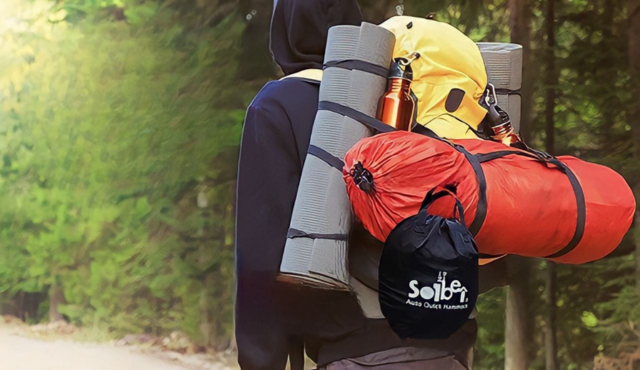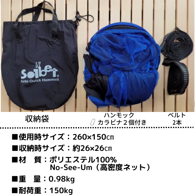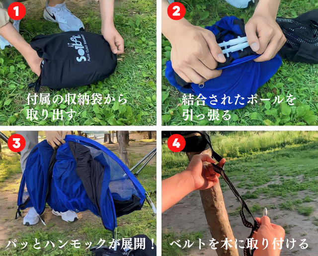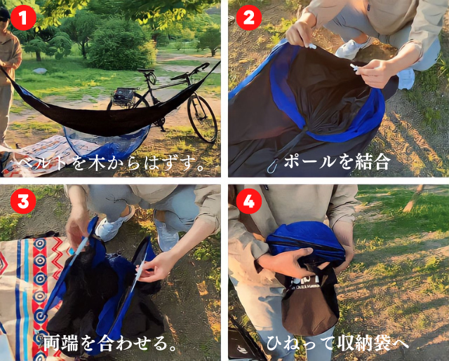 とても軽く、ハンモックはコンパクトに 折りたためるので持ち運びに便利! さらにポータブル収納袋が付いているので、 荷物の負担を増やすことなく快適です。