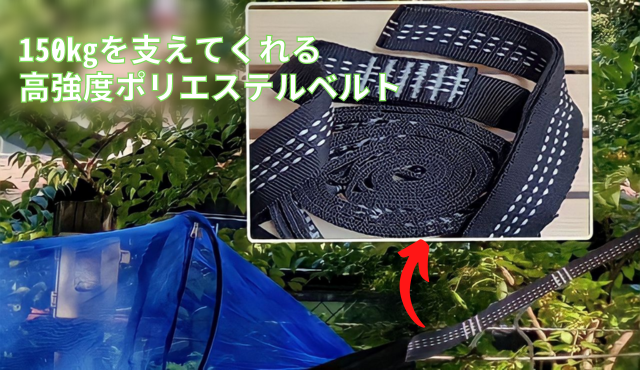 A:しっかりと取り付けられているか、サポートが強いか ハンモックに体重をかけて(肘をついて上半身の体重を少しずつかける)みて、たわみ具合をチェックしてください。