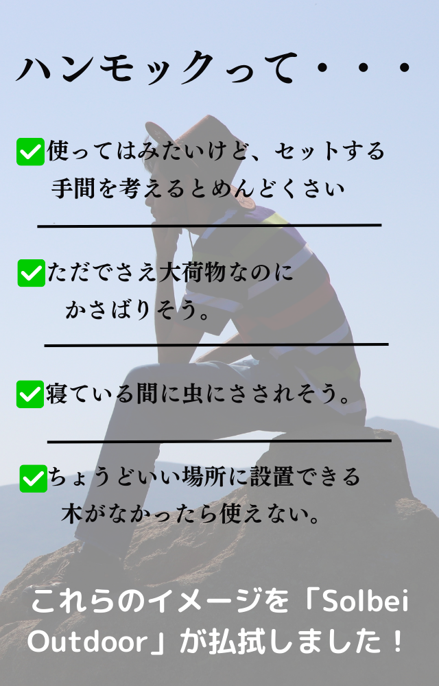 せっかくハンモックを持ってきたのに、設置に丁度いい木がない! でも使いたい! そんな時は直接地面に設置して虫を気にすることなく 景色を眺めながら使ってみてはどうでしょうか。