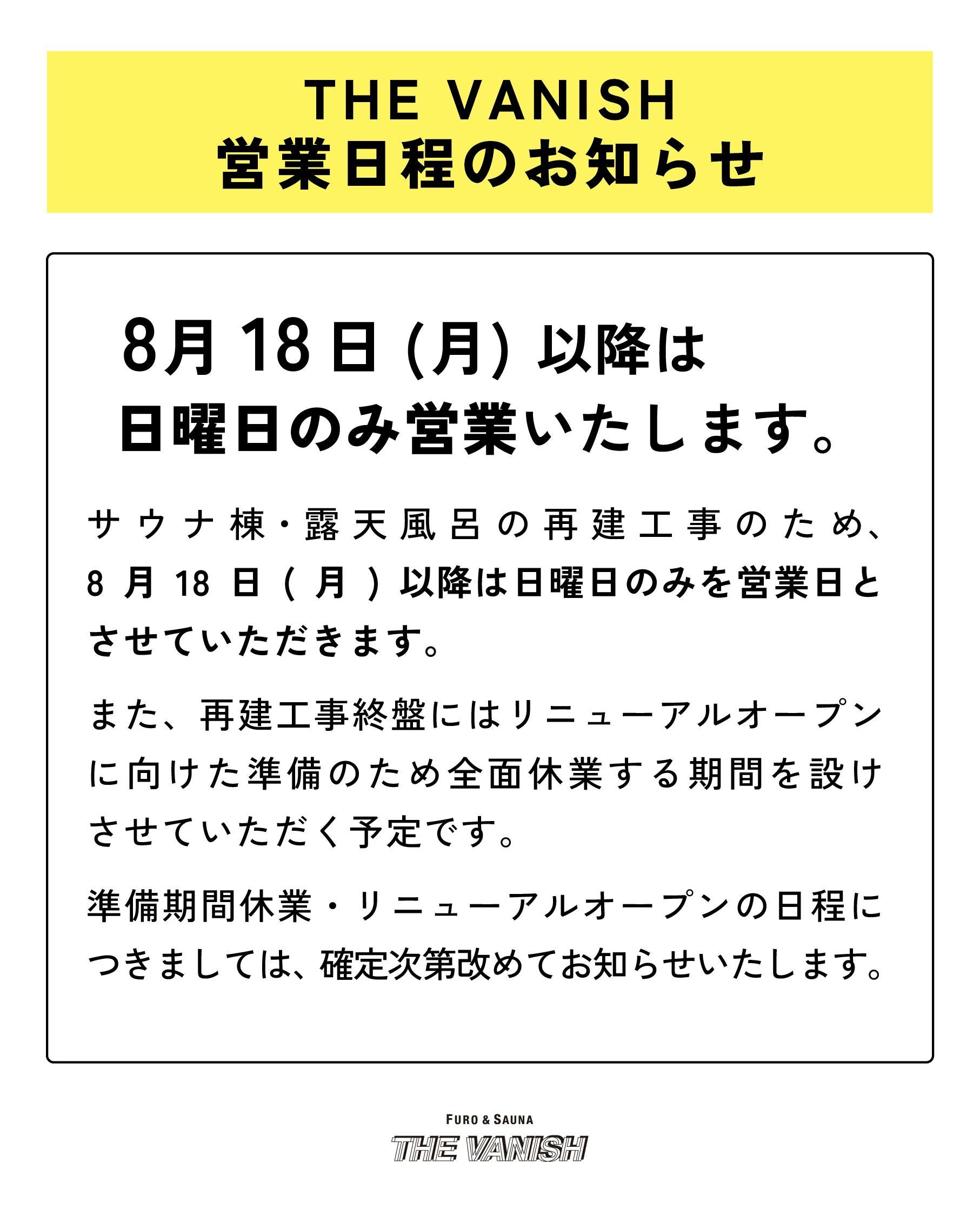 THE VANISH は日曜も含め一時的に全面休業させていただきます。