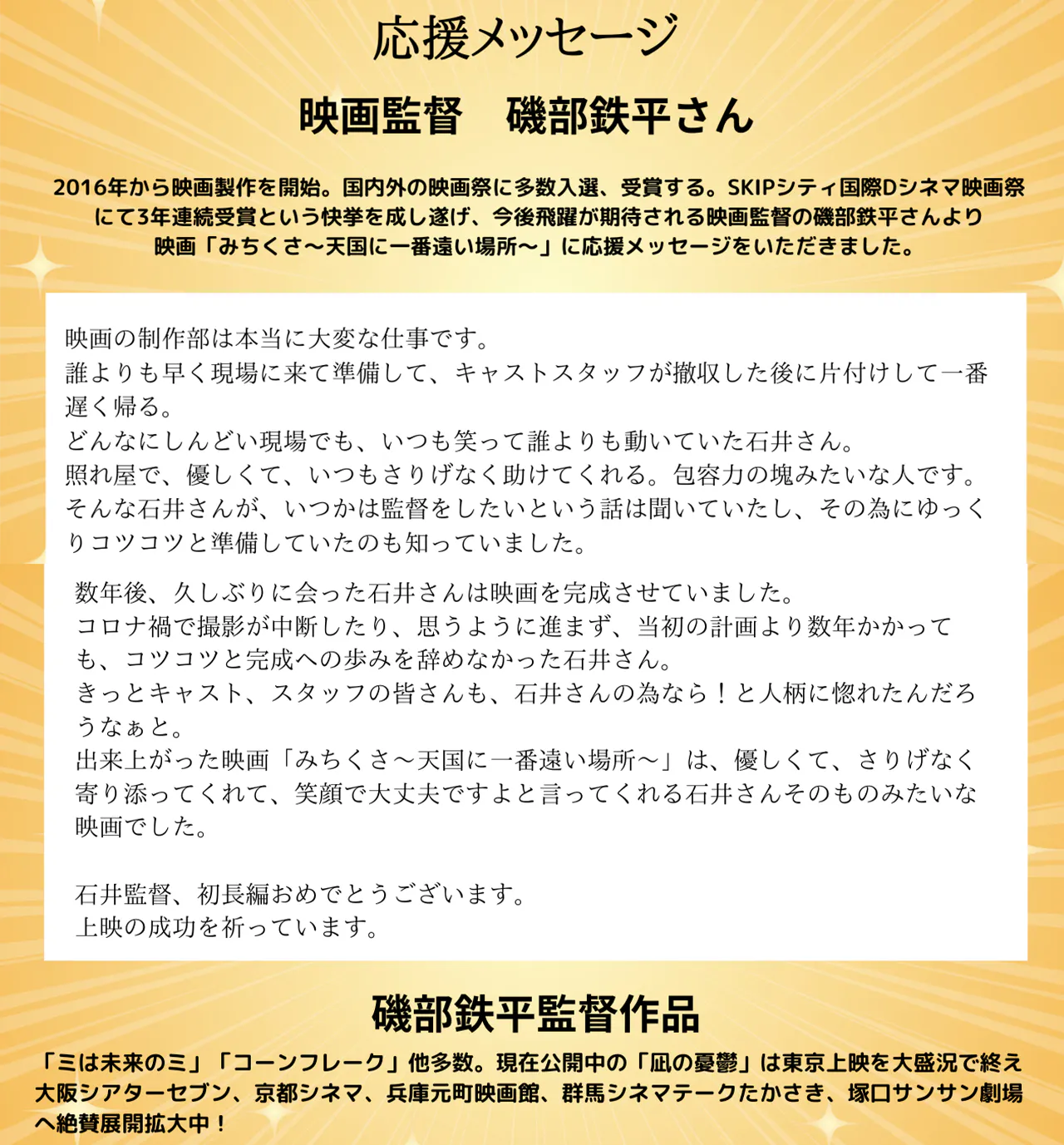 映画監督 磯部鉄平さんより応援メッセージをいただきました!