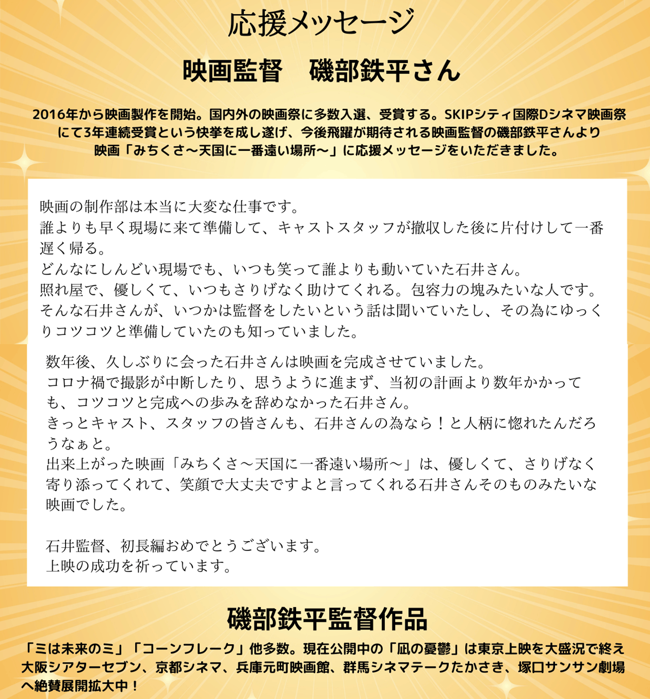 映画監督 磯部鉄平さんから応援メッセージをいただきました!