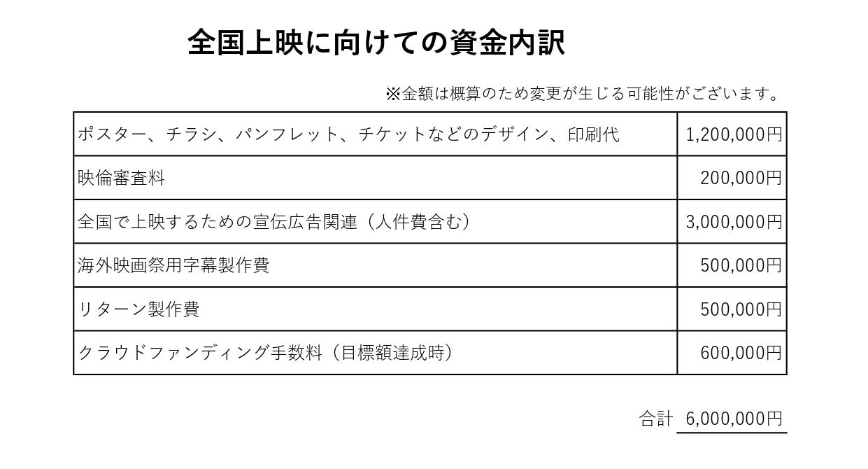 ご支援いただいた資金は、全国での劇場公開に際しての諸費用や国内外映画祭への応募費用に充てさせていただきます。皆様のご期待に応えられますよう全力で取り組みます。ご支援のほどよろしくお願い致します。