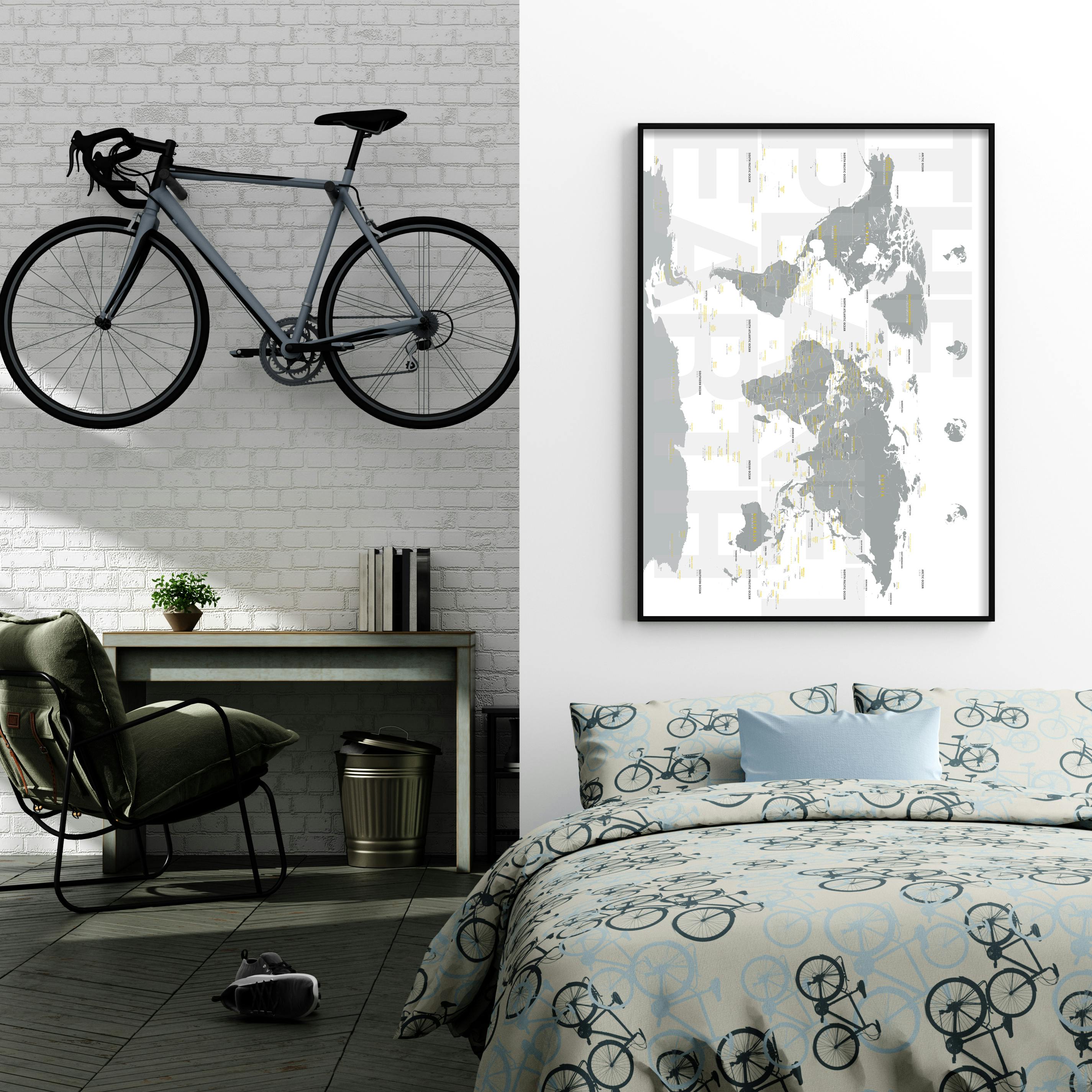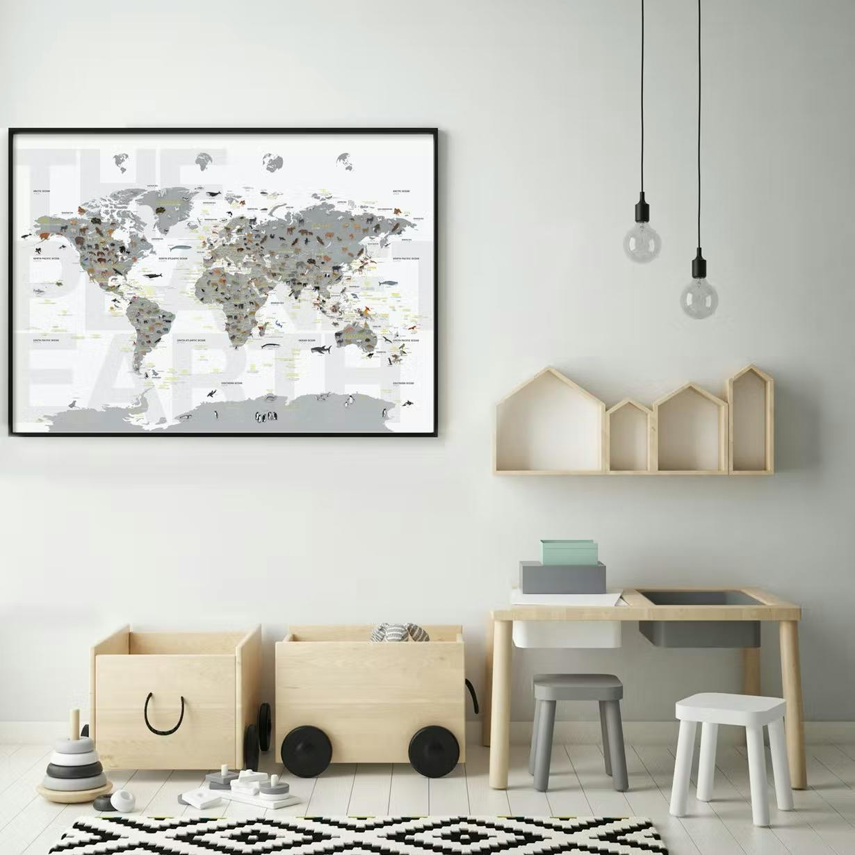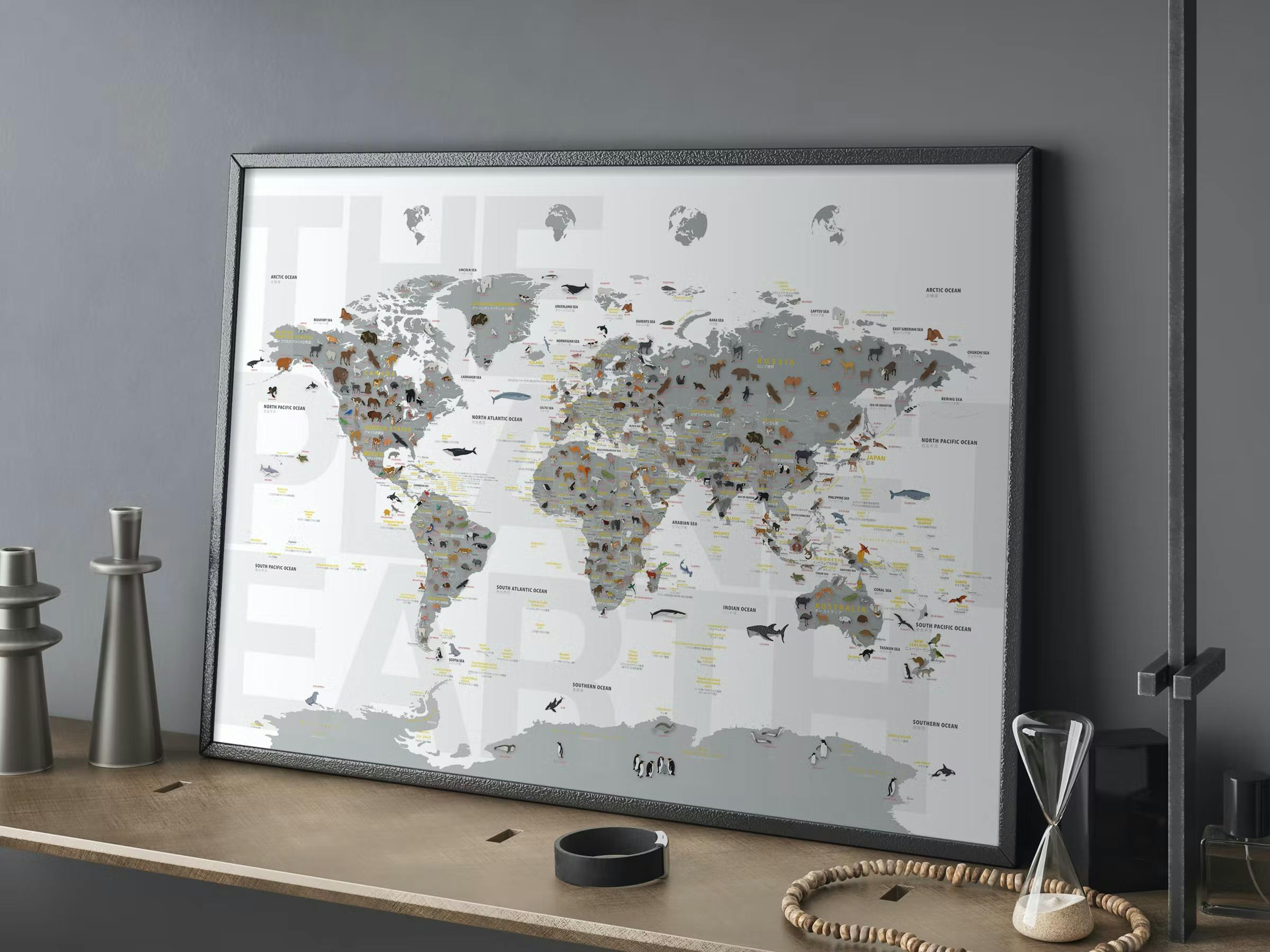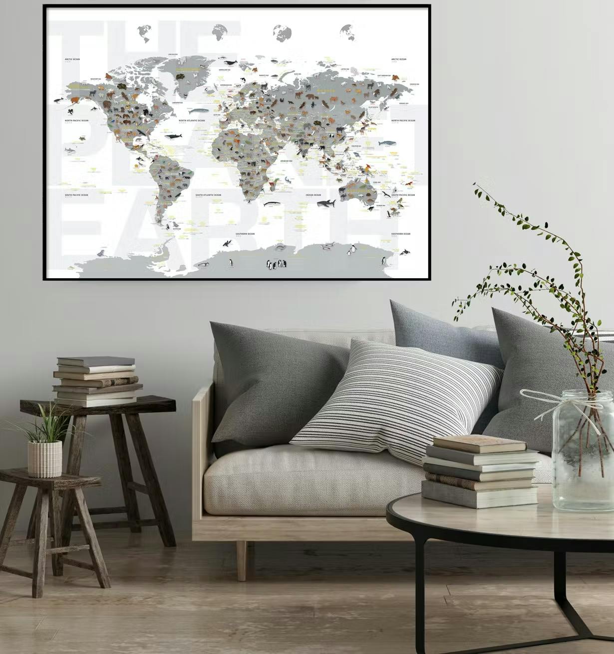 「どうぶつせかいちず」と「インテリアのための世界地図」は、壁に掛けるか、または床に置いて壁に立て掛けるだけで、日常の風景をおしゃれな空間に変えてしまうことでしょう!