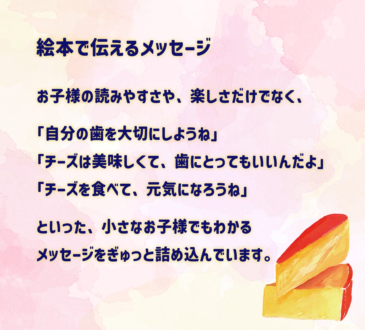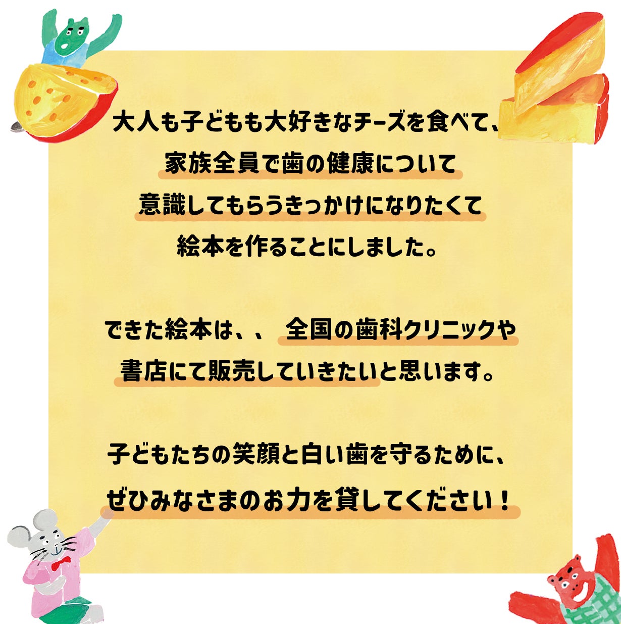 その思い出の一冊を「チーズと歯の絵本」が担うことで、歯の健康につながる習慣作りができたら嬉しいと考えています。