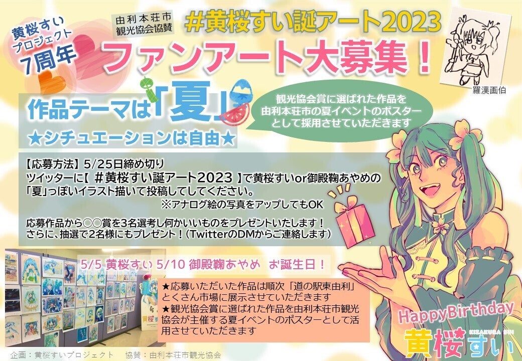 由利本荘市観光協会さんに協賛いただき、黄桜すいのファンアートを大募集!#黄桜すい誕アート2023のハッシュタグをつけてTwitterに投稿してください。観光協会賞に選ばれた作品は夏のイベントポスターとして採用させていただきます。詳しくはこちらをご覧ください。