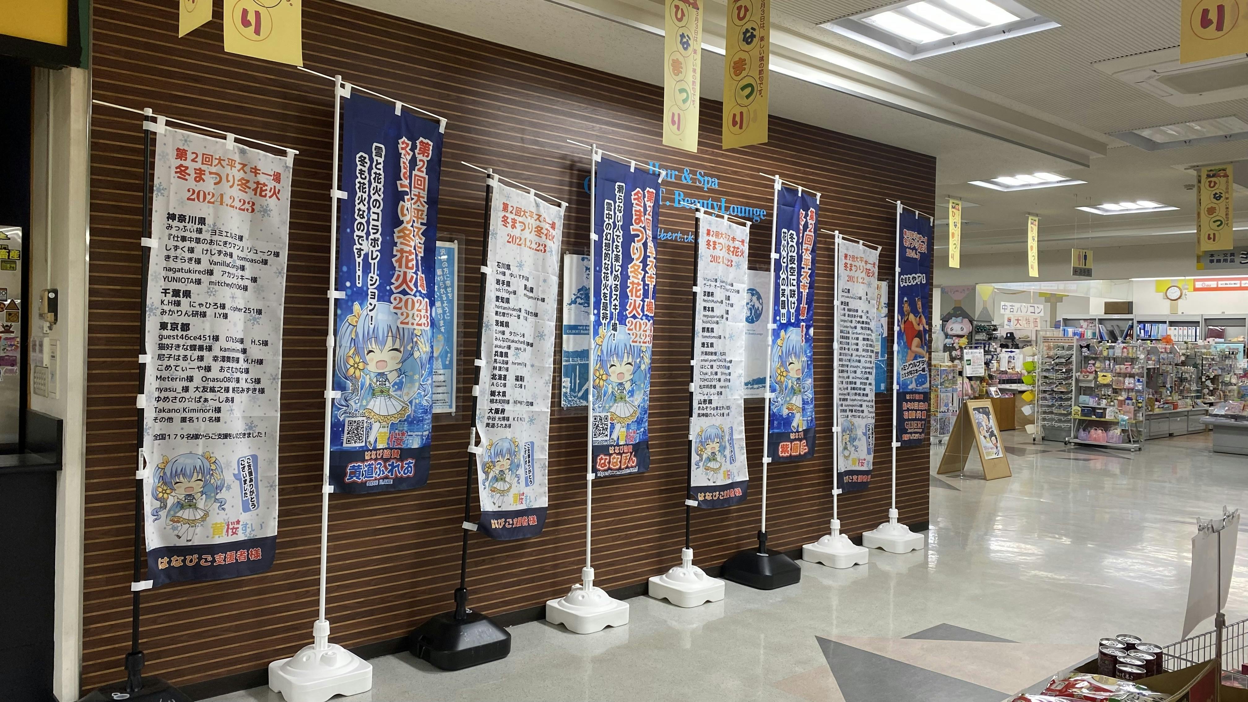 本日、イベントのぼりが到着して、道の駅東由利ショッピングプラザぷれっそ様に展示させていただきました。展示は2/22まで、2/23イベント当日は大平スキー場に展示いたします。