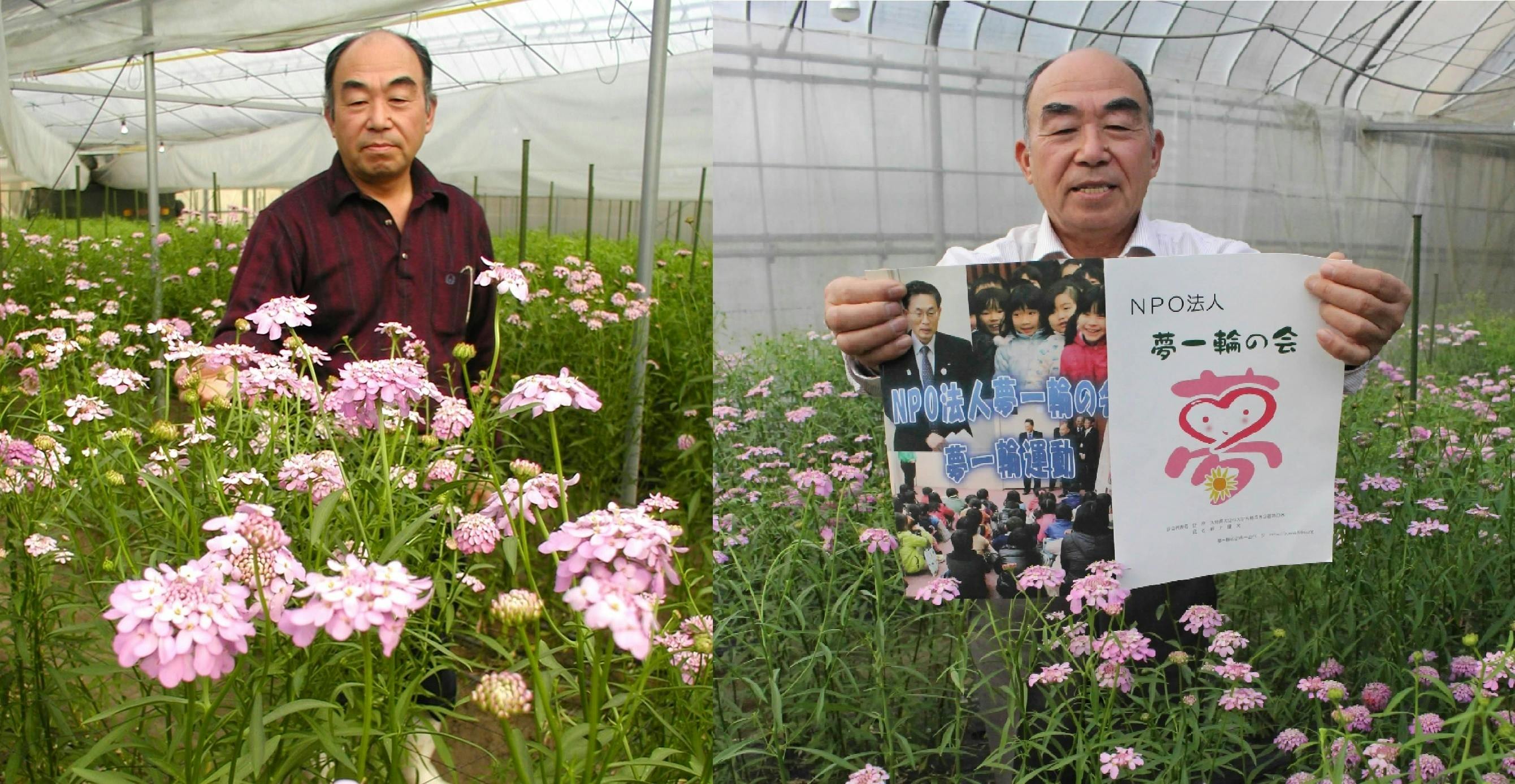 私は野上健次と申します。50歳で脱サラして花農家となり、自身の花のブランドを確立するとともにNPO法人夢一輪の会を設立し花育活動に情熱を注いできました。