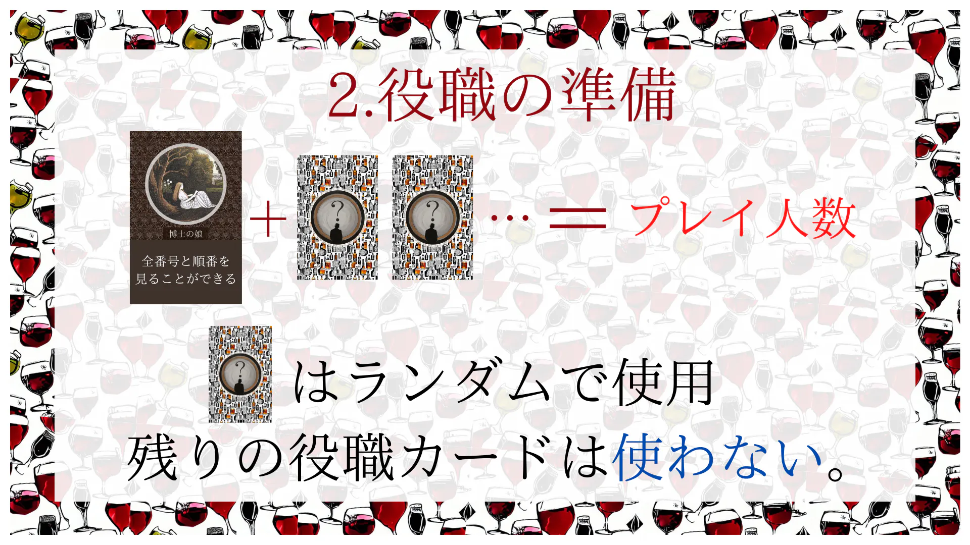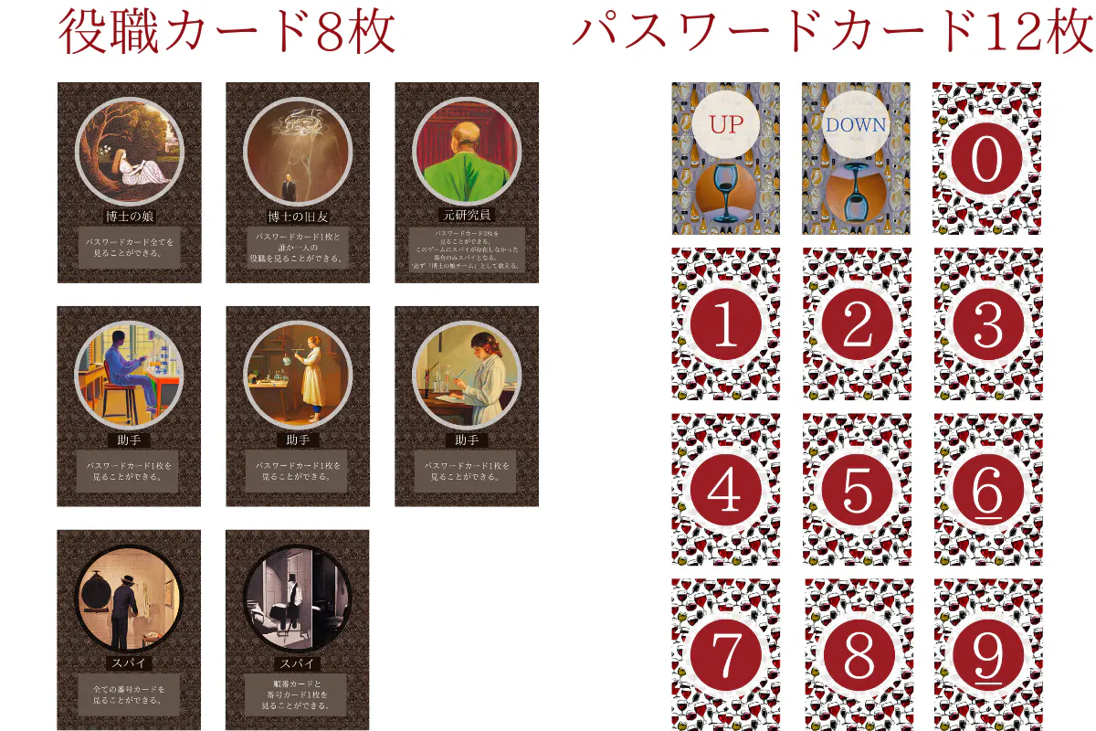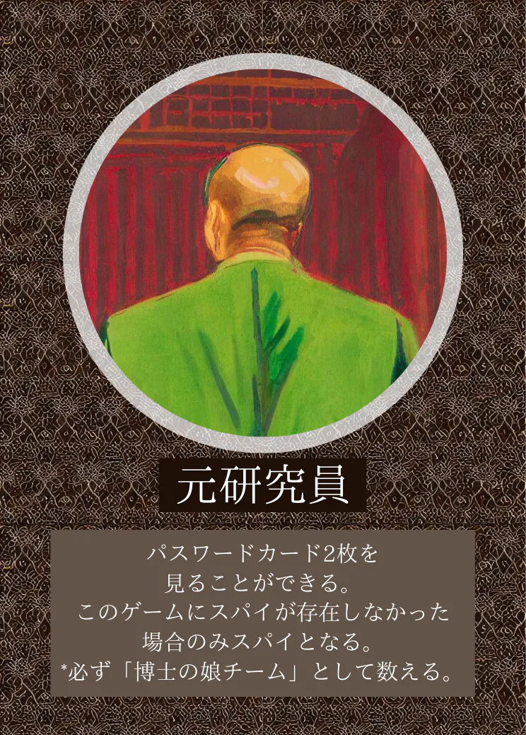 このゲームでは「博士の娘」を必ず使用しますが、スパイを含めた他7つの役職については、使用するか否かをランダムに決定します。