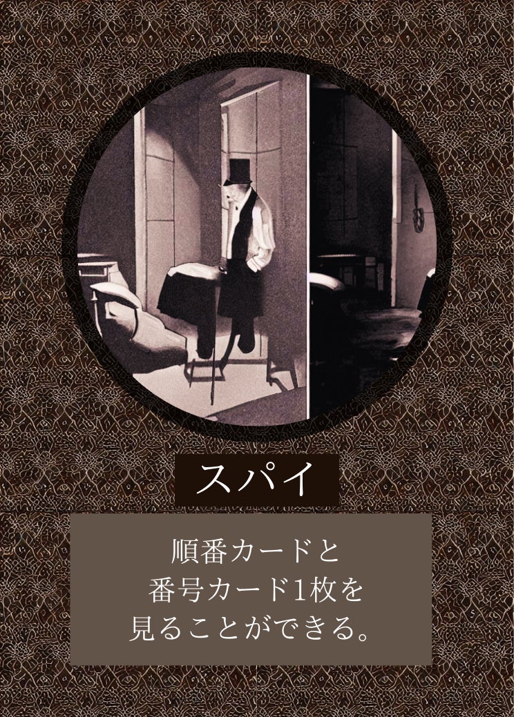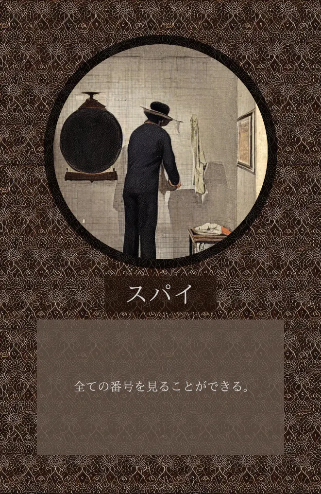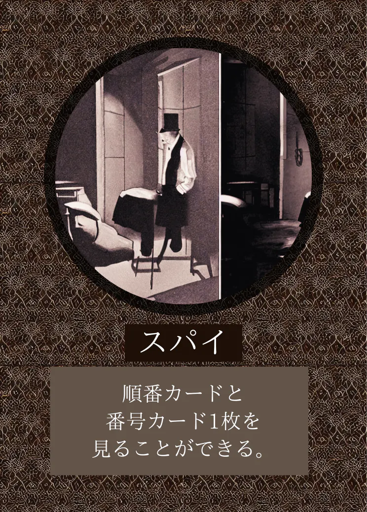 能力: カード2枚を見ることができる(番号と順番が対象)。このゲームにスパイが存在しなかった場合のみスパイとなる。