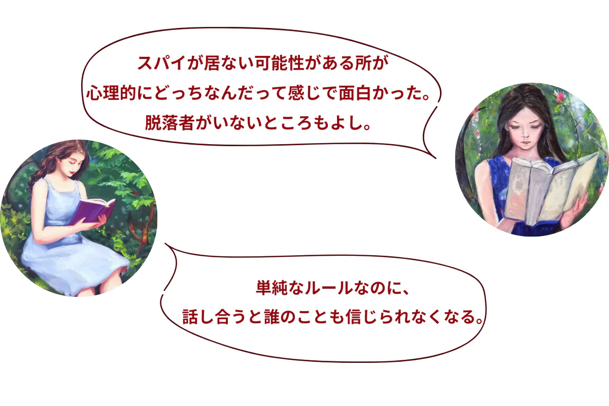 少人数の時のみ「本当はみんな味方かもしれない」という可能性を持たせることで、人数が少なくてもゲームに深みが出るのです。