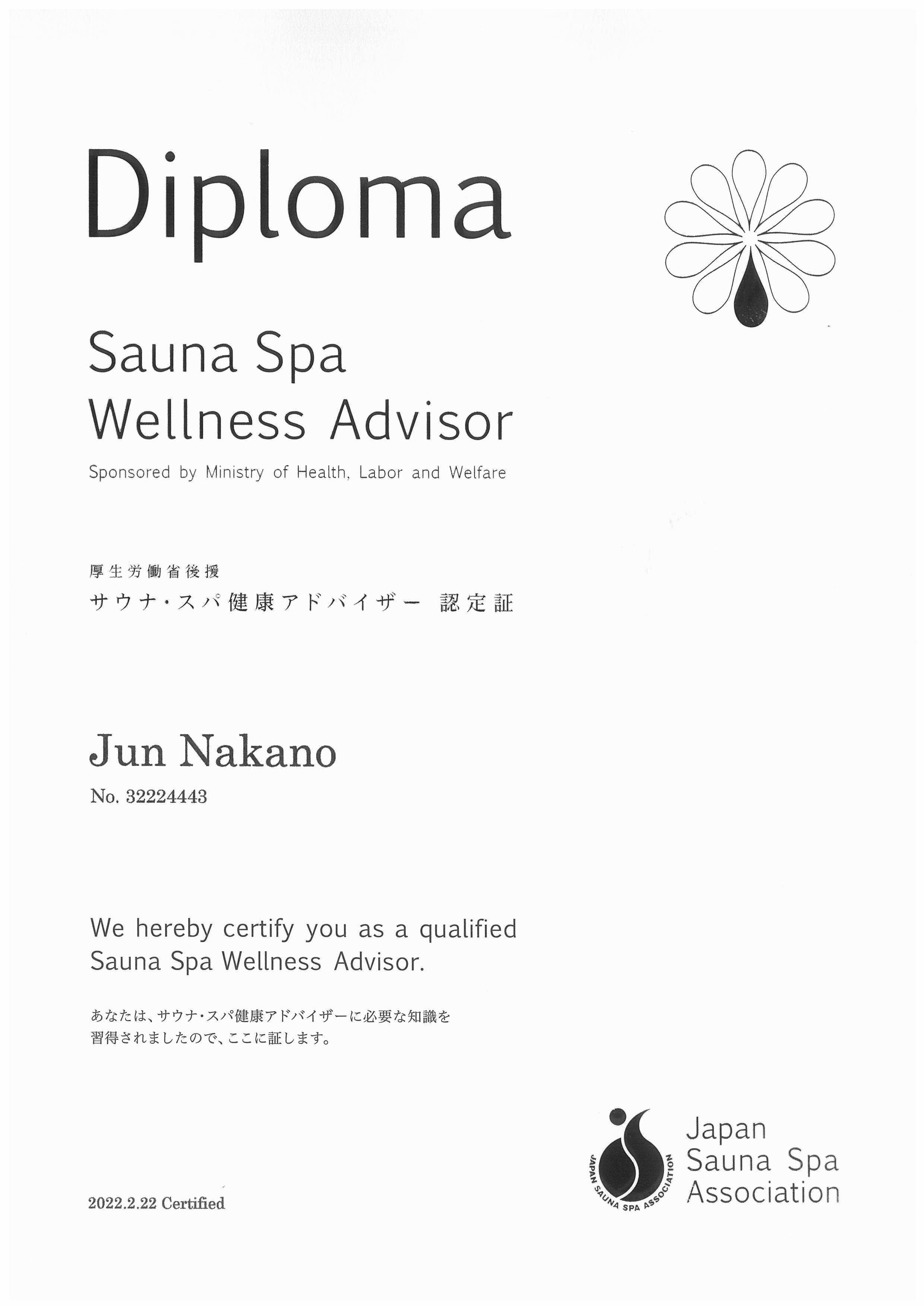 <公益社団法人日本サウナ・スパ協会認定の「サウナ・スパ 健康アドバイザー認定証」 >