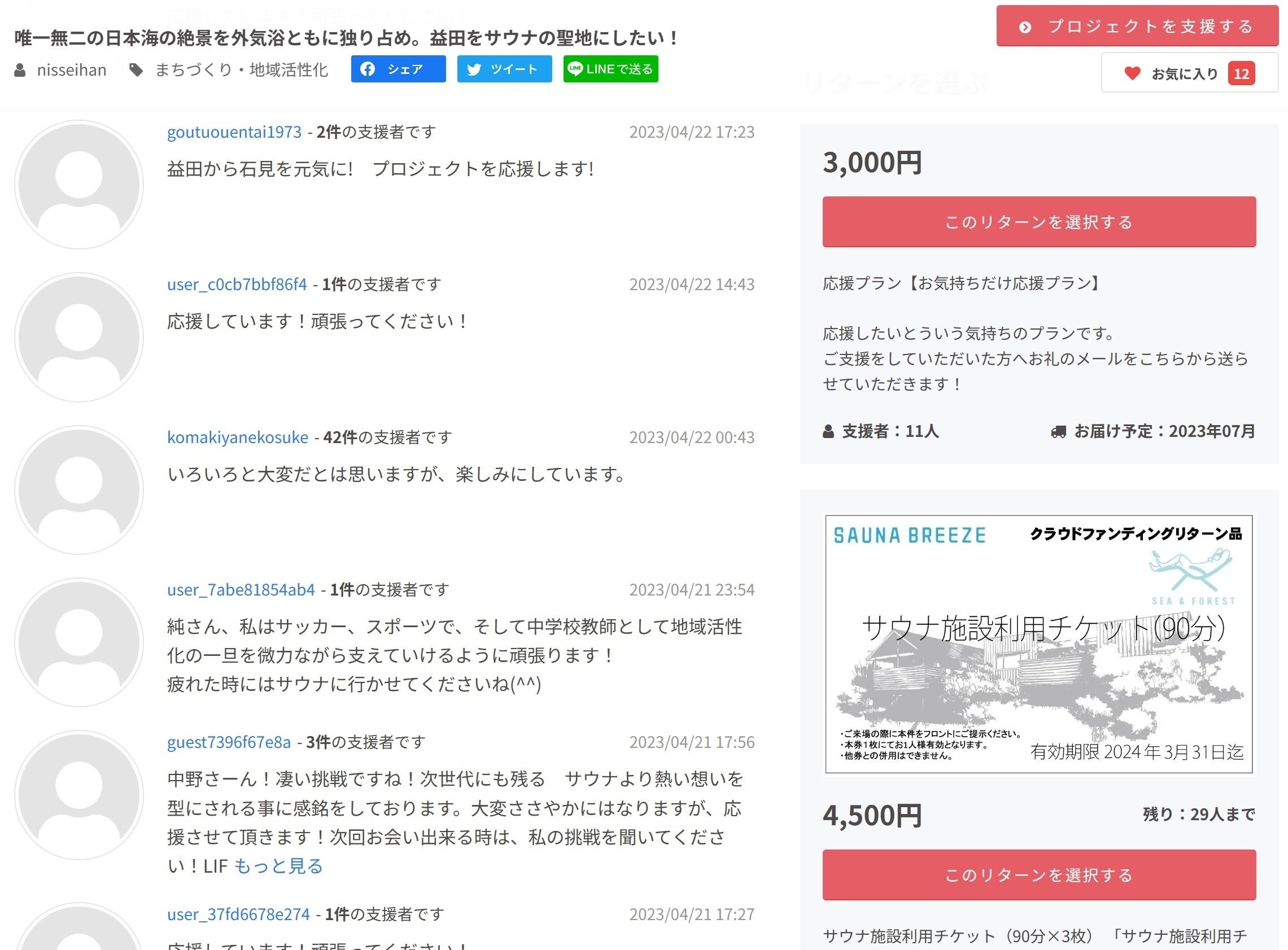 ご支援をいただいています皆さまからの応援メッセージを紹介します。ご支援いただきます皆さまからの暖かいメッセージをありがとうございます。日々の励みと力になっています。本当にありがとうございます。また紹介したいと思います。※今回、数量を限定にしておりましたリターン品につきまして選んでいただきありがとうございます。反面リターン品の一部がOUT OF STOCKになってしまい申し訳ございません。価格面が少し上昇しますが、サウナチケット90分のものを3枚にしてのリターン品を追加いたしました。加えまして支援者さんからの要望などに極力お答えできるようにとTシャツのみとタオル+オリジナルシール3点付のリターン品をご用意しました。引き続き、目標に向けて頑張ります!ご支援を賜りますよう、よろしくお願い申し上げます。