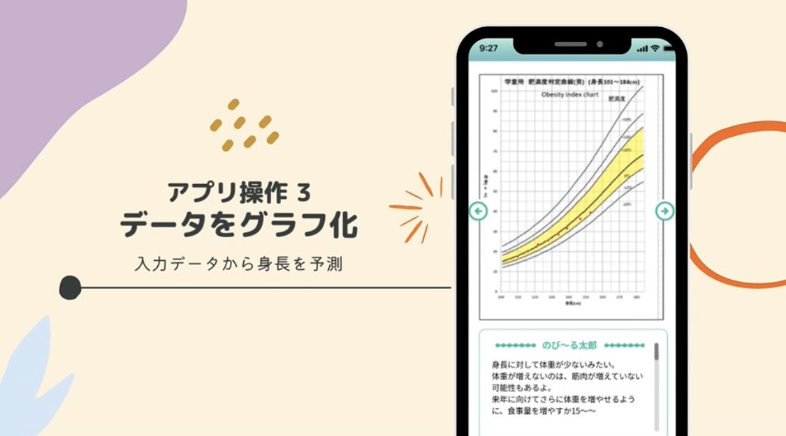 日本人の平均身長は30年間変わっていませんが、身長の高い子どもと身長の低い子どもが増えており、身長の格差が広がっています。つまり、身長が伸び悩む子どもが増えている状況です。身長は遺伝的要因が高いとは言えず、成長期のライフスタイルが大きく影響する*)と言われています。そして、身長を伸ばせる期間は2年間しかありません。身長が大きく伸びる成長スパート期に、いかに伸ばせるかが身長を高くするポイントです。のびーるキッズプロジェクトは、身長格差の広がりを日本の社会課題と考え、身長とライフスタイルの因果関係を明らかにする研究です。この因果関係を明らかにするためには、10,000人の身長に関するデータを収集する必要があります。そのために開発したのが、身長アプリ「のびーるキッズ」です。身長アプリ「のびーるキッズ」は、お子さんの身長や体重を入力することで、成長段階をグラフで表示してくれます。このアプリ開発には、多くの方の手を借りて形になりました。これまで、関わってくださった皆さまへ改めて感謝申し上げます。