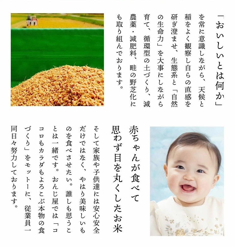 高級旅館の料理長からもご好評いただいています。創業以来、おんじ屋が「全国のお米銘産地に負けないお米を作りたい」という想いで、創業以来ずっと作り続けてきた、大定番のお米。食べて後悔はさせません。