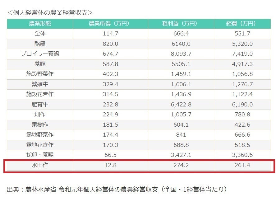 米農業は、数ある農作物の中でも利益率が特に低い業種の1つです。下記は個人農家さんの平均収支を示したもので、"水田作”は圧倒的に所得が低くなっています。