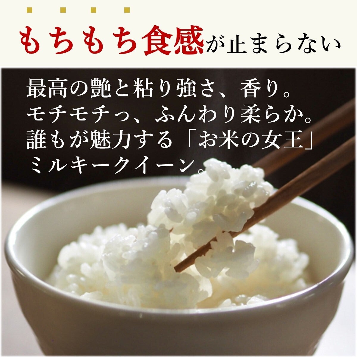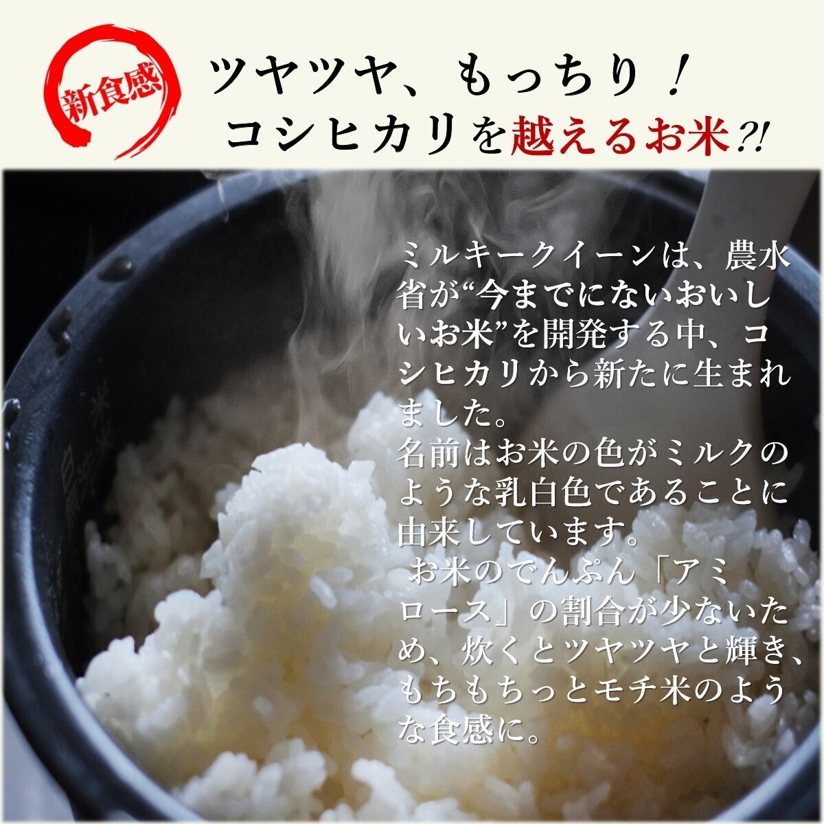 「お米の女王」とも呼ばれるミルキークイーンは甘くてもちもちっとした食感と、冷めてもやわらかくて美味しい特長のお米です。