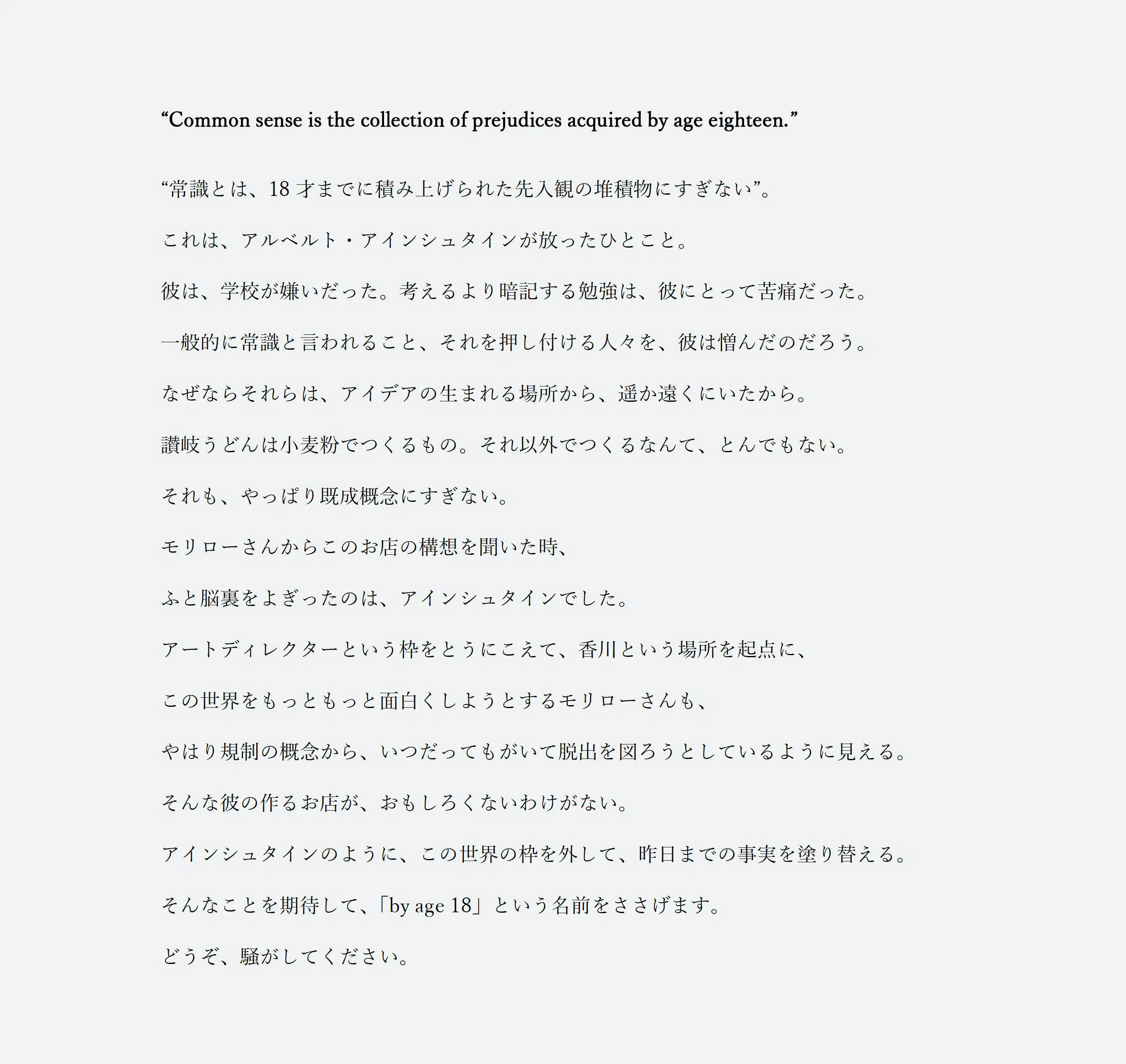 そうして決まった店名は「by age 18(バイエージエイティーン)」。アインシュタインの名言「Common sense is the collection of prejudices acquired by age 18.(常識とは、18才までに積み上げられた先入観の堆積物にすぎない。)」という文言から発想されたネーミングです。