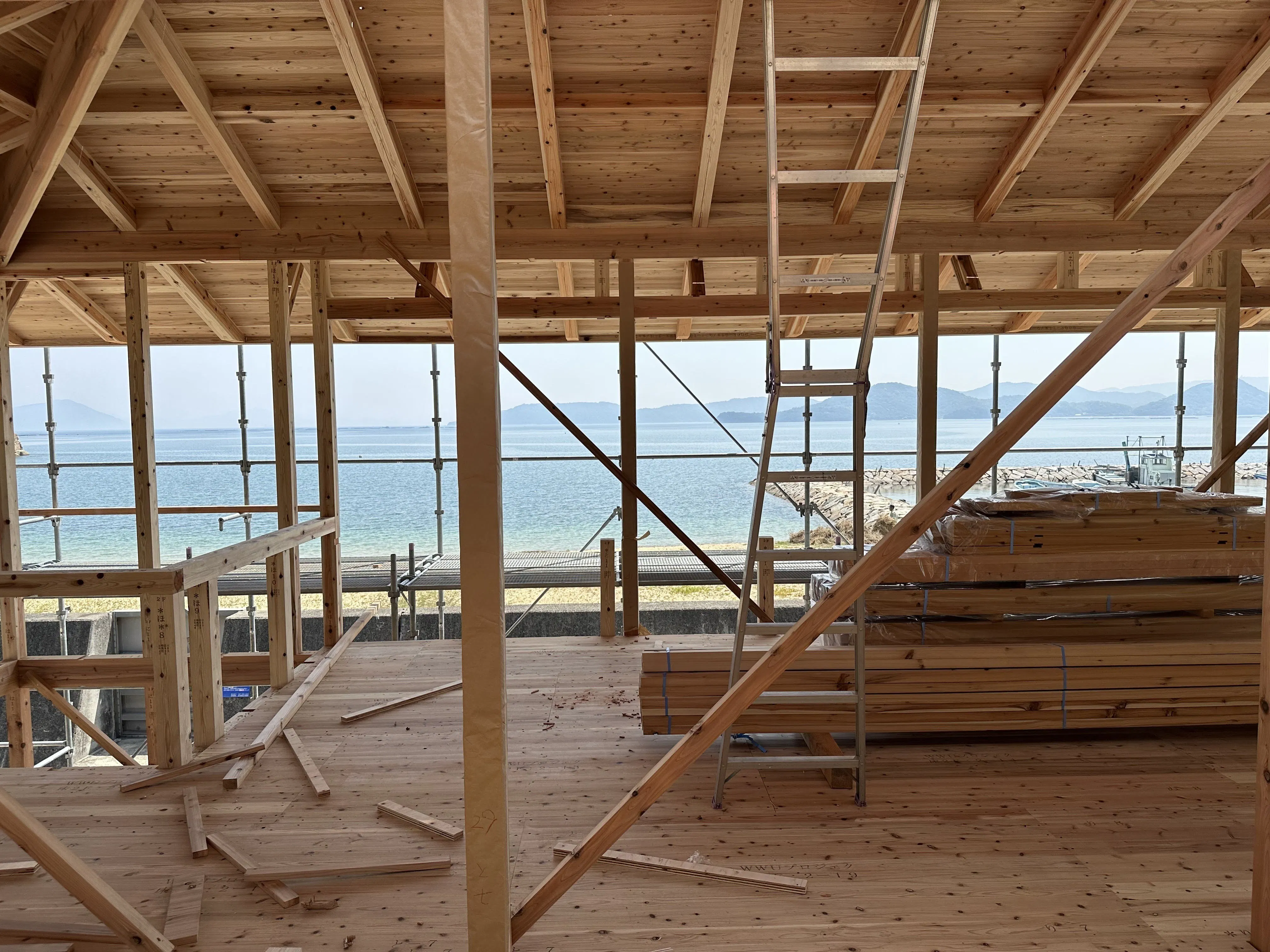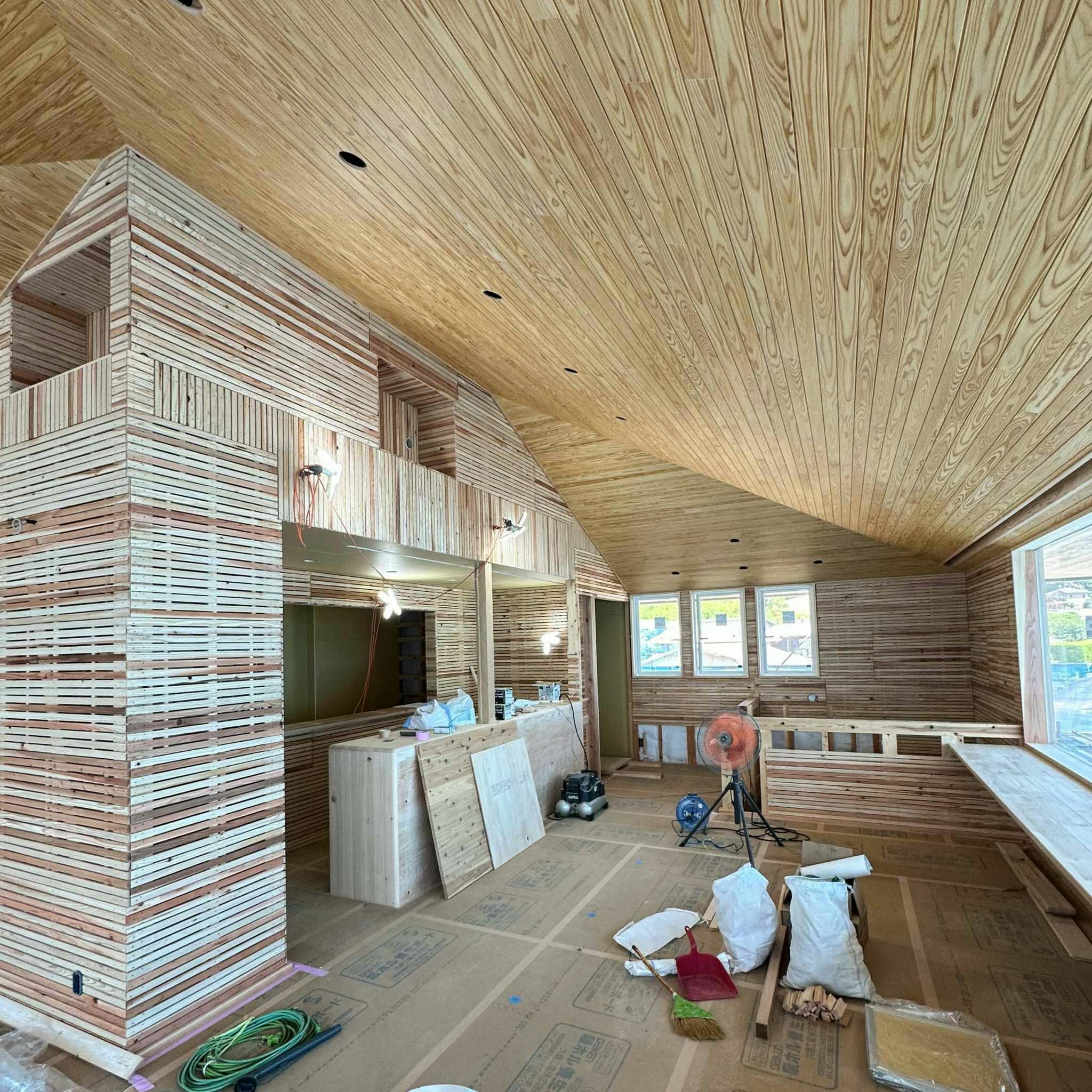 2023/07/28 11:04クラウドファンディングの挑戦が終了してからおよそ3週間が経ちました。その間にも着々と店舗の工事は進んでおり、先日天井がお披露目になりました!想像よりも高い屋根で開放感がすごくあります。窓ガラスも設置され、瀬戸内海の景観が一望できる様になりました。大きな窓から覗く海へとつながる景色がうっすらとご覧いただけます。(遮るものがなくなったらと考えるとワクワクします)ブルーシートが取れたらまたお披露目したい、、!本当に素敵な景色がここからは楽しめます。カウンターや奥にあるキッチンの様子も感じられます。(個人的にはカウンターの角が丸いところに優しさを感じています!)皆さんがゆっくりとした時間を過ごせる空間になりつつある状態です。様々なプロダクトを取り扱う1階スペースの天井も完成しました。こちらも天井から壁に至るまで木のぬくもりを感じていただけます。(木の香りすら感じてしまいそうです)8月からはいよいよ、焼杉が外壁に張られたり、瀬戸の漆喰の佐官工事が行われます!瀬戸の漆喰の見学会を予定しておりますので、お楽しみに♪また、米粉うどん麺も試作中!米粉うどん麺についても配合や茹で加減、どう食べたら美味しくなるか?をメンバーで話し合いながら研究中です。秋には、試食会なども開催できたらなと考えております、、!また、返礼品も着々と準備を進めています。早くお届けできるようにがんばります!!これからもNO BORDER UDONプロジェクトを応援いただければ幸いです。 もっと見る