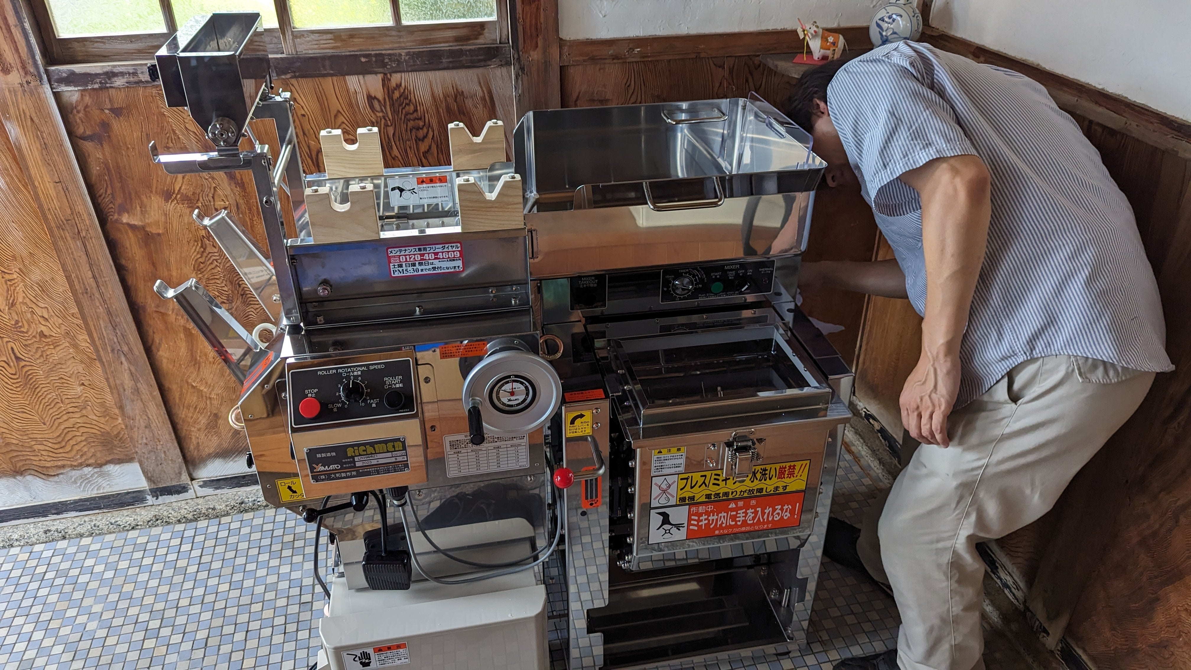 現在は店舗が内装工事中のため、敷地内の元喫茶店に一旦設置をして早速製麺機を稼働させています。