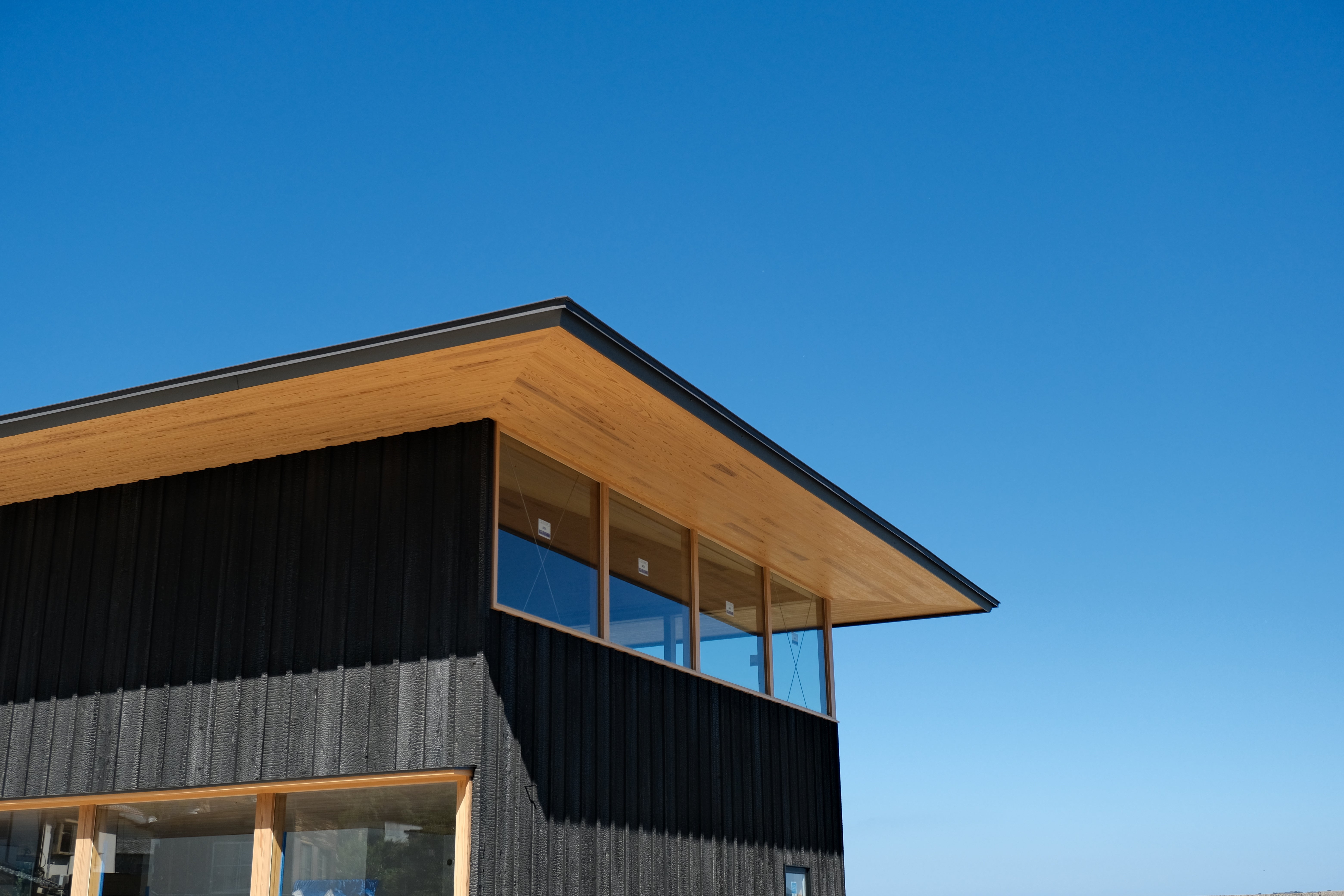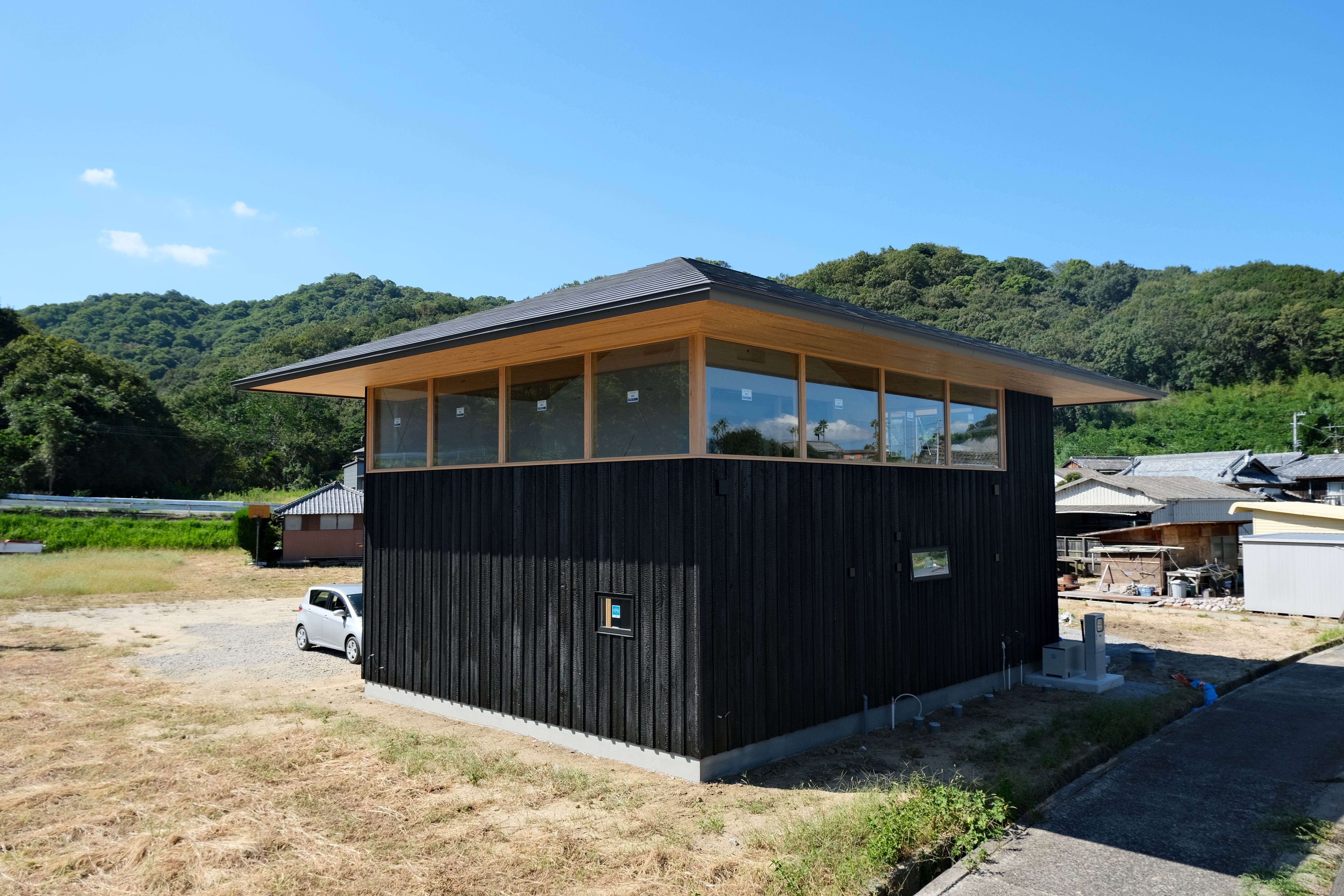 店舗の工事も順調に進んでいて、店舗外観には焼杉が貼られ、瀬戸漆喰も仕上げ作業が進んでいます。