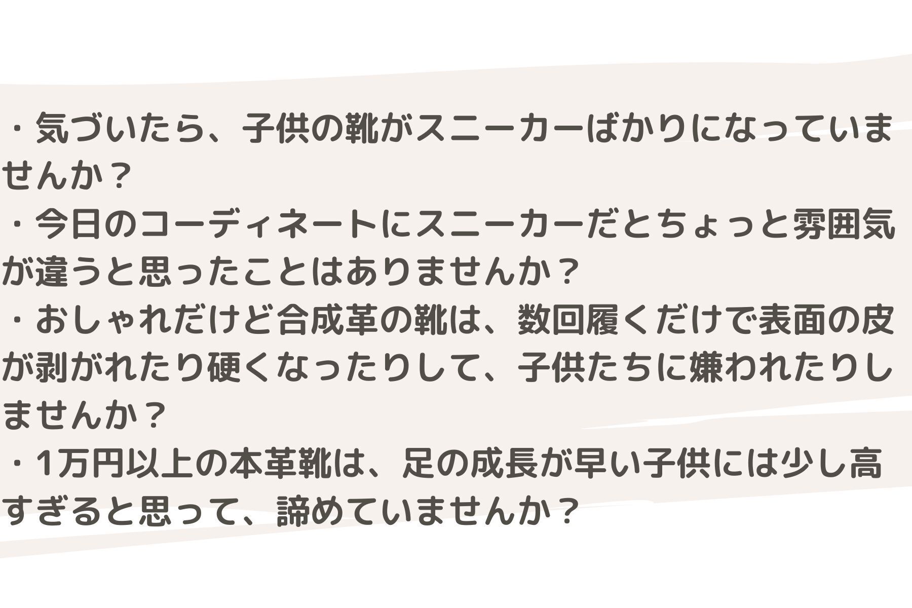 子供の足の成長が早く、すぐサイズアウトしてまいますので、本革はもったいないと思われがちかもしれませんが、"子供こそ、本革靴を履くべきだ"、と私が思っています。