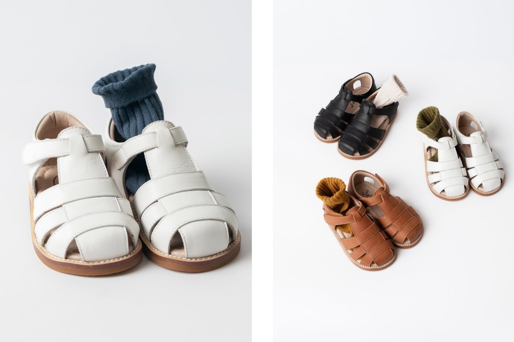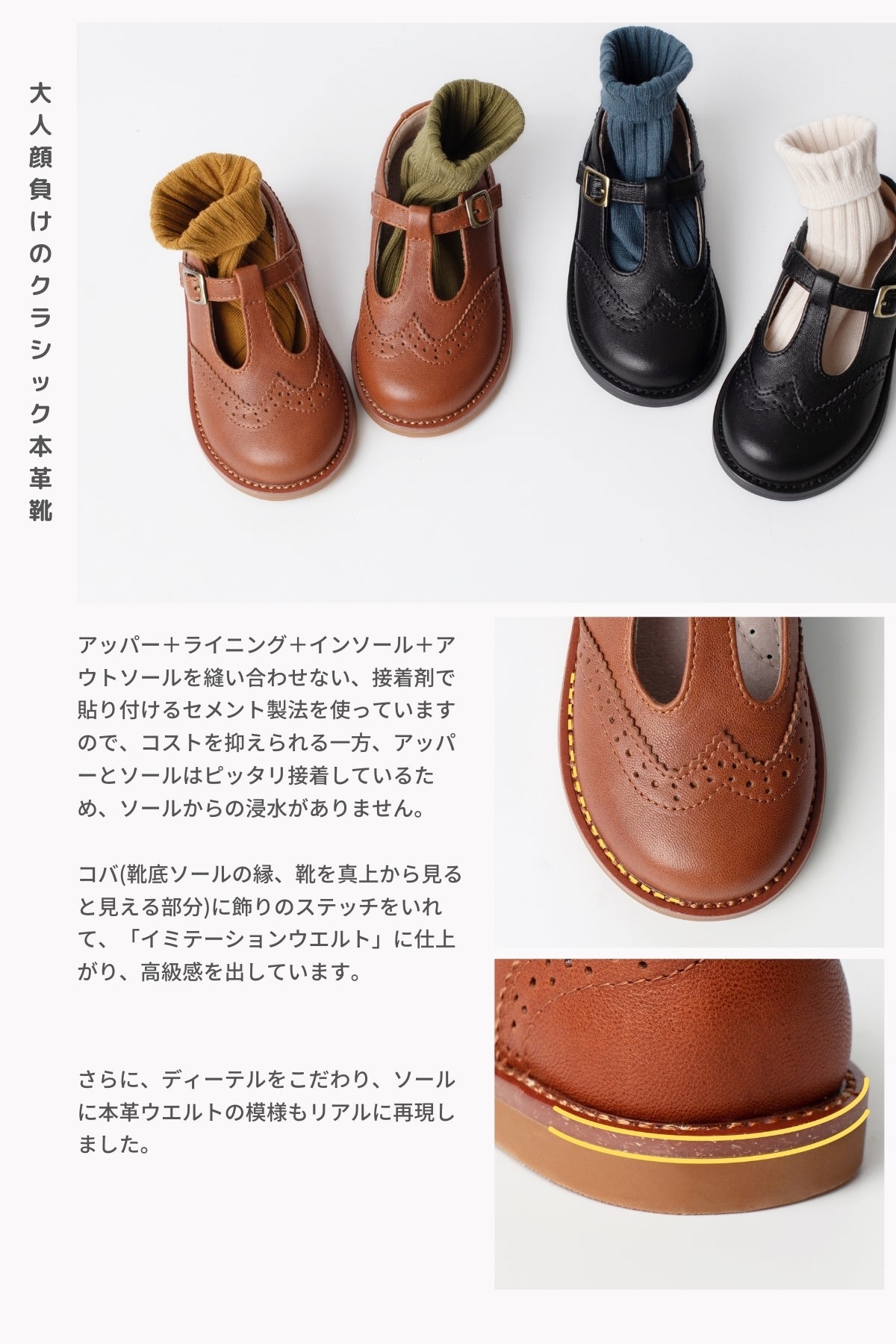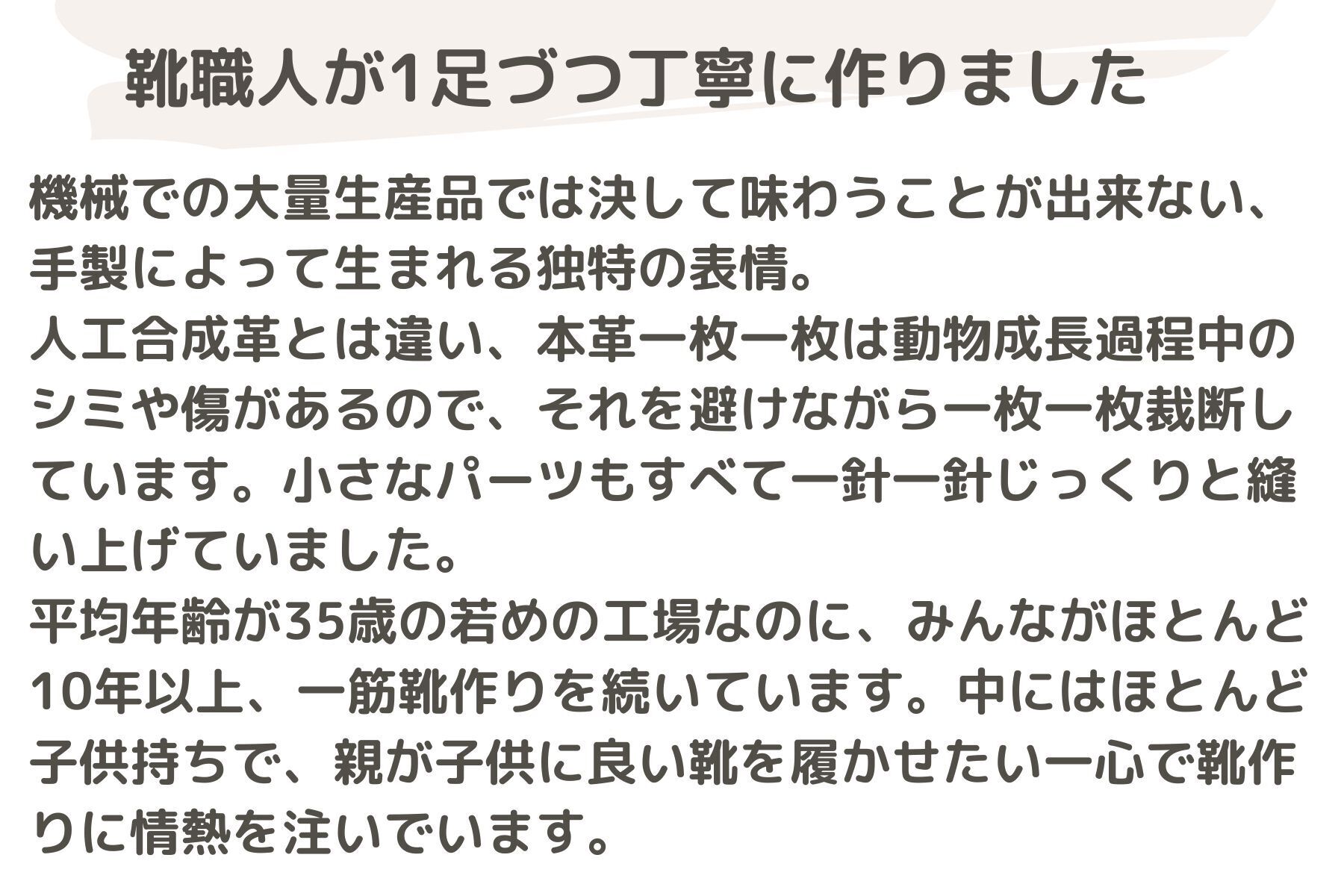 国内外の靴工場を探し回り、ついに素敵な靴職人と出会いました。彼らと近距離でコミュニケーションをとり、何度も細かな修正を繰り返し、2歳から入学前のお子様向けに、普段着としてもフォーマル用としても使える、理想の一足が生まれました!