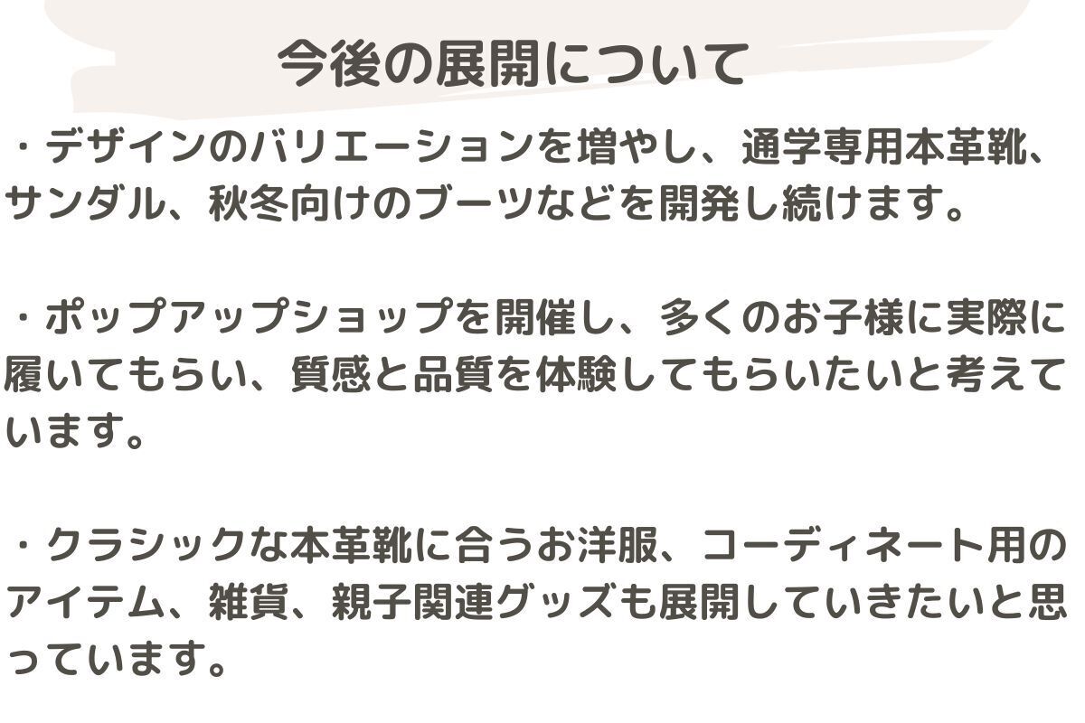 →おしゃれで、運動靴と変わらない履きやすさ、しかも、お手ごろの価格で買えられる子供本革靴、作ればいいと考え始めました。