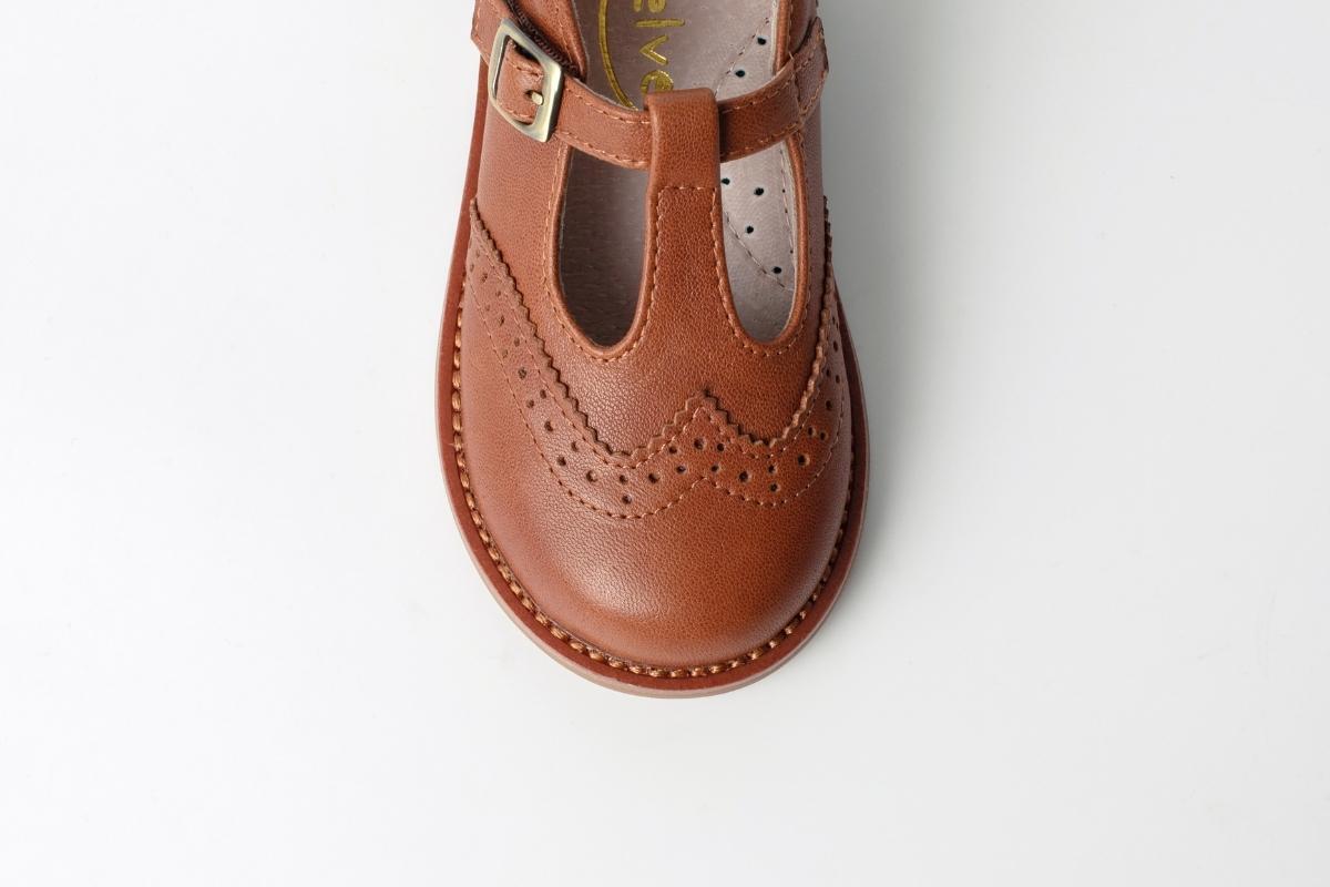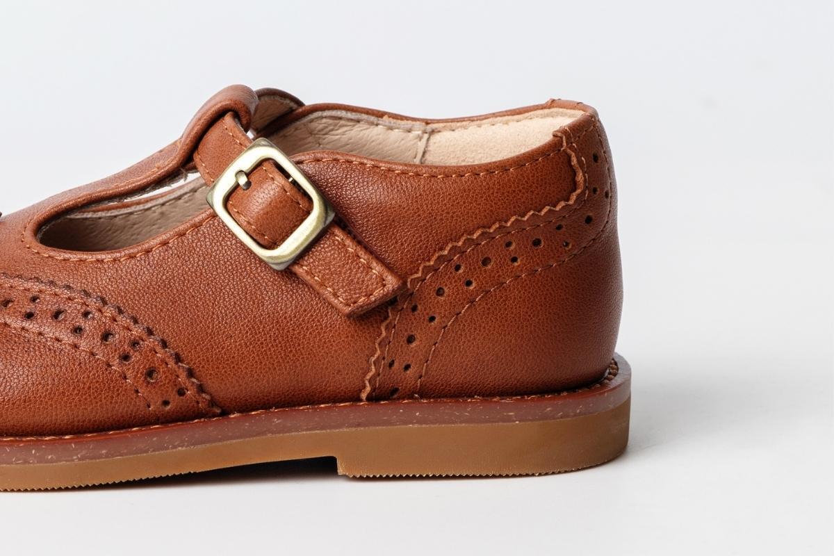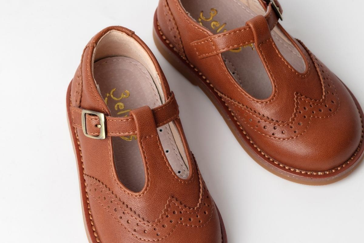 ブローグ装飾が華やかで、落ち着いたブラウンとブラックの2色の組み合わせによって、ビンテージ感がありながらおしゃれに仕上がっています。切り替えが多いのが特徴的なデザインであるため、子供用靴の小さなパーツを一つ一つ丁寧に縫い上げました。