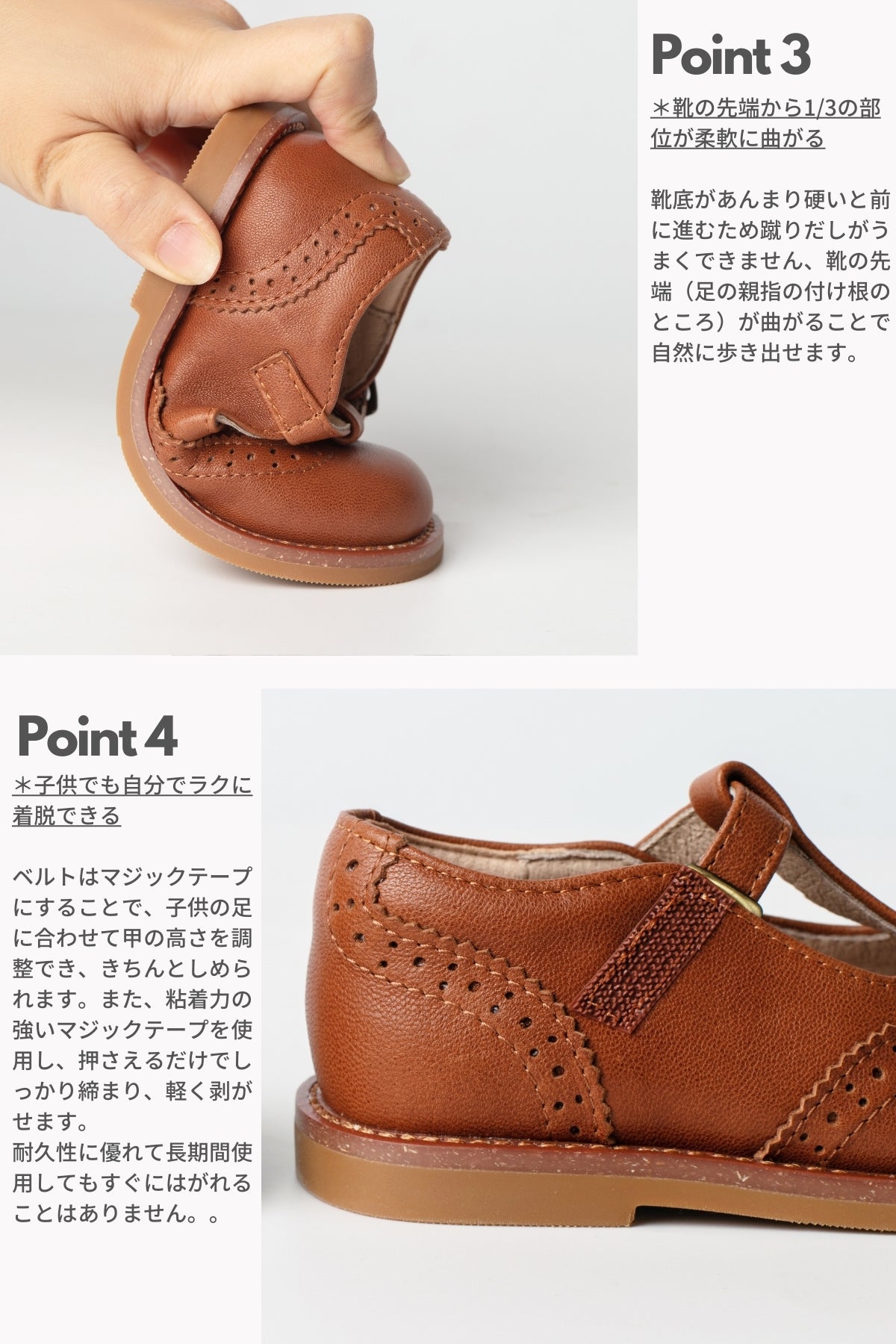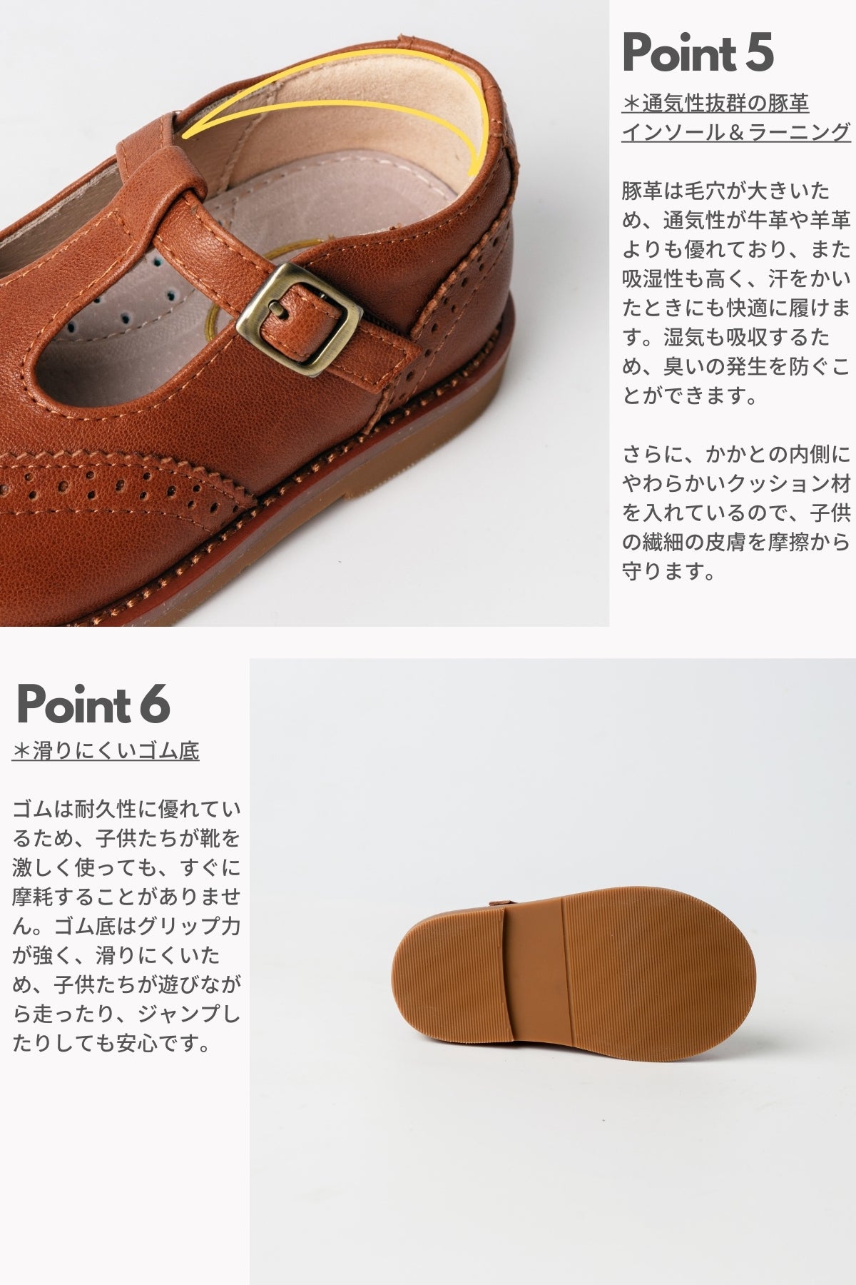 本革は、優れた吸湿性と放湿性を持ち、通気性が良く、「呼吸する素材」と称されます。天然素材の中でも、この2つの特性において非常に優れており、多湿な日本の気候においては大きな意味を持ちます。特に子供は、大人と比較して汗腺が密集し、発汗量が多くなります。汗をかくと、本革靴の立体的な構造によって水分を吸収・放出し、汗を吸収・分散してくれます。