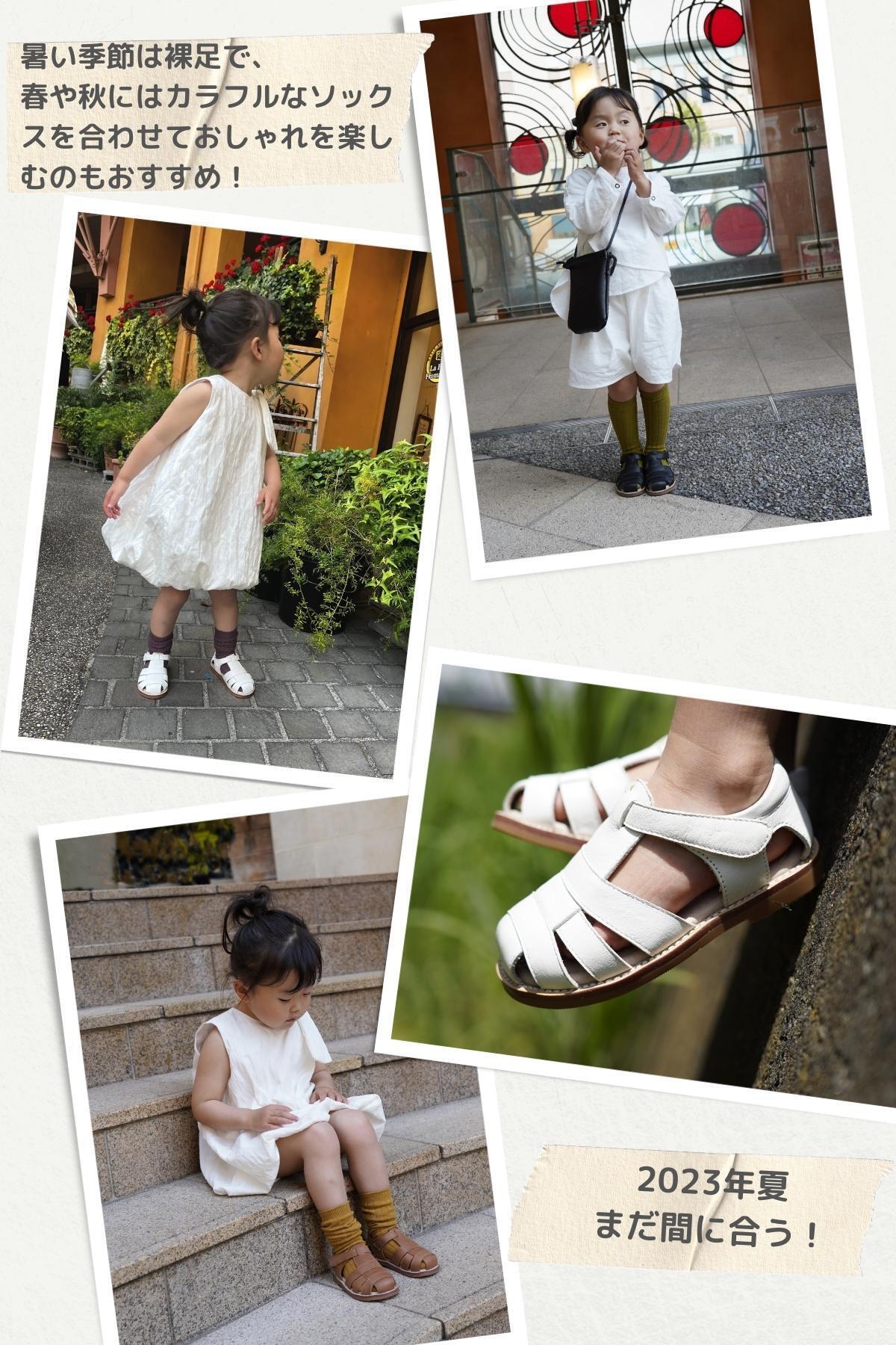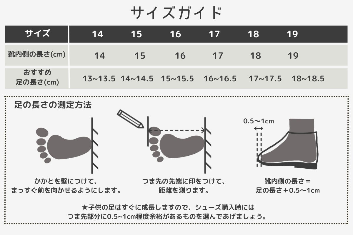 サイズガイドに詳細サイズを記載いたしましたので、お子様の足のサイズを測って頂いた上で、ご検討くださいませ。