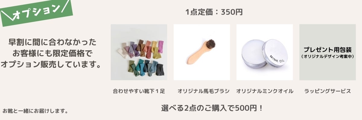 超早割:8月お届け限定 20名様 オプション2点セット(靴下1足、本革ケアミンクオイル)
