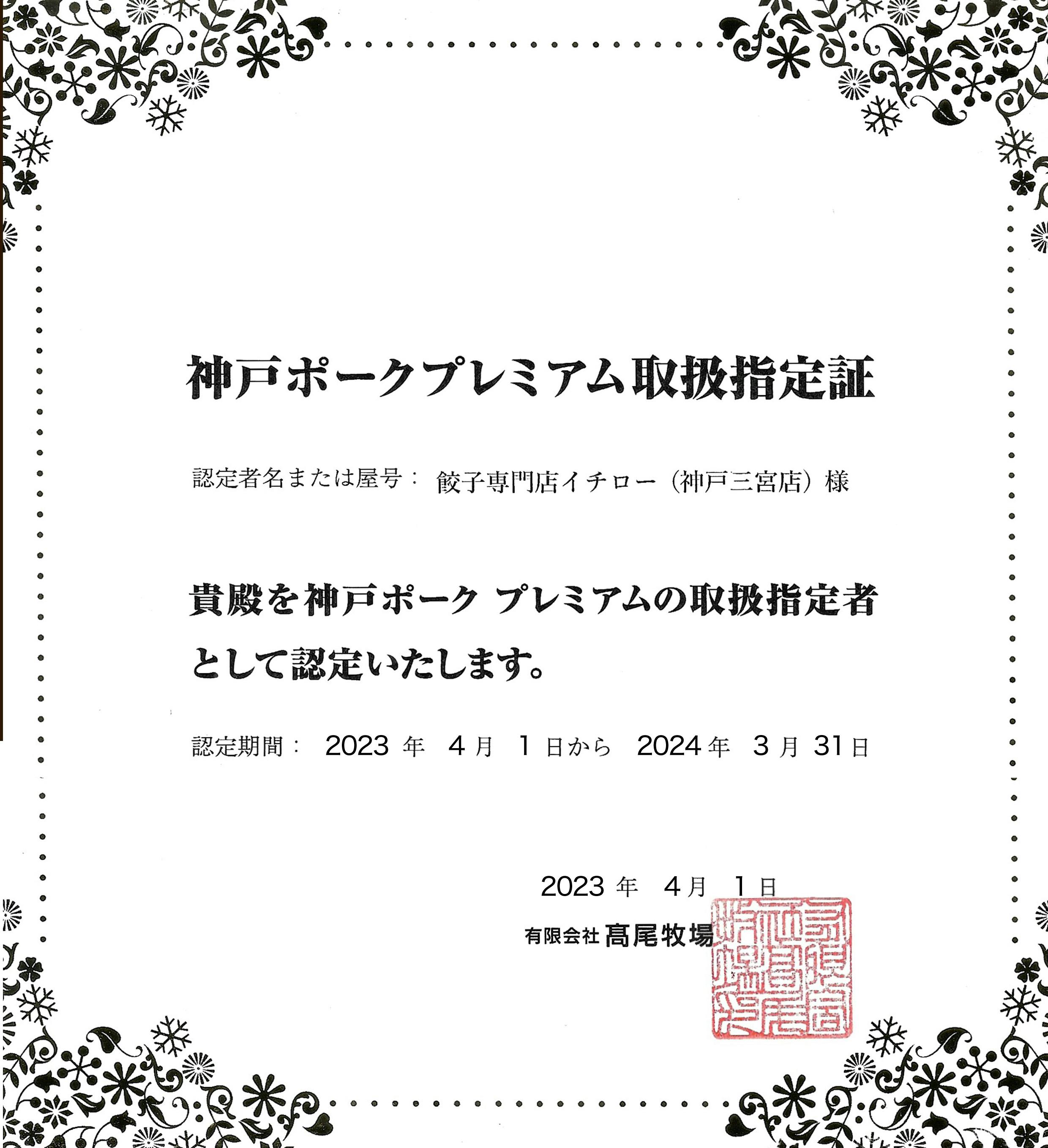 餃子専門店イチローさんはこの希少なブランド豚「神戸ポークプレミアム」の正式な取扱指定者として現在も認定されていることもあり、